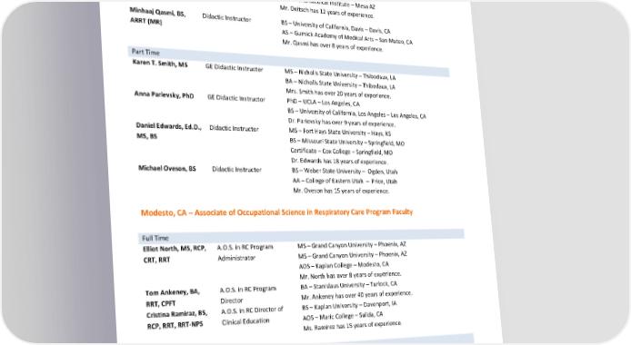 Robert Trimboli, ARRT Program Coordinator BSDMI – Gurnick Academy – Concord, CA AS – Gurnick Academy – Modesto, CA Mr. Trimboli has 5 years of experience. Jesse Kleis, MS GE Didactic Instructor MA – CSU Dominguez Hills – Carson, CA BA – CSU Long Beach – Long Beach, CA AA – Orange Coast College – Costa Mesa, CA Mr. Kleis has over 7 years of experience. Steve Deitsch, ARRT, Didactic Instructor BS – University of Phoenix – Online BS AOS – Pima Medical Institute – Mesa AZ Mr. Deitsch has 12 years of experience. Minhaaj Qasmi, BS, Didactic Instructor BS – University of California, Davis – Davis, CA ARRT (MR) AS – Gurnick Academy of Medical Arts – San Mateo, CA Mr. Qasmi has over 8 years of experience. Part Time Karen T. Smith, MS GE Didactic Instructor MS – Nicholls State University – Thibodaux, LA BA – Nicholls State University – Thibodaux, LA Mrs. Smith has over 20 years of experience. Anna Parievsky, PhD GE Didactic Instructor PhD – UCLA – Los Angeles, CA BS – University of California, Los Angeles – Los Angeles, CA Dr. Parievsky has over 9 years of experience. Daniel Edwards, Ed.D., Didactic Instructor MS – Fort Hays State University – Hays, KS MS, BS BS – Missouri State University – Springfield, MO Certificate – Cox College – Springfield, MO Dr. Edwards has 18 years of experience. Michael Oveson, BS Didactic Instructor BS – Weber State University – Ogden, Utah AA – College of Eastern Utah – Price, Utah Mr. Oveson has 15 years of experience. Modesto, CA – Associate of Occupational Science in Respiratory Care Program Faculty Full Time Elliot North, MS, RCP, A.O.S. in RC Program MS – Grand Canyon University – Phoenix, AZ CRT, RRT Administrator MS – Grand Canyon University – Phoenix, AZ AOS – Kaplan College – Modesto, CA Mr. North has over 8 years of experience. Tom Ankeney, BA, A.O.S. in RC Program BA – Stanislaus University – Turlock, CA RRT, CPFT Director Mr. Ankeney has over 40 years of experience. Cristina Ramiraz, BS, A.O.S. in RC Director of BS – Kaplan University – Davenport, IA RCP, RRT, RRT-NPS Clinical Education AOS – Maric College – Salida, CA Ms. Ramirez has 15 years of experience. Part Time Modesto, CA – Vocational Nurse Program Faculty Full Time Revised by: Gurnick Academy of Medical Arts Process Department Page 25 of 60 Effective Dates: January 1, 2024, to December 31, 2024 Date of Revision: March 1, 2024