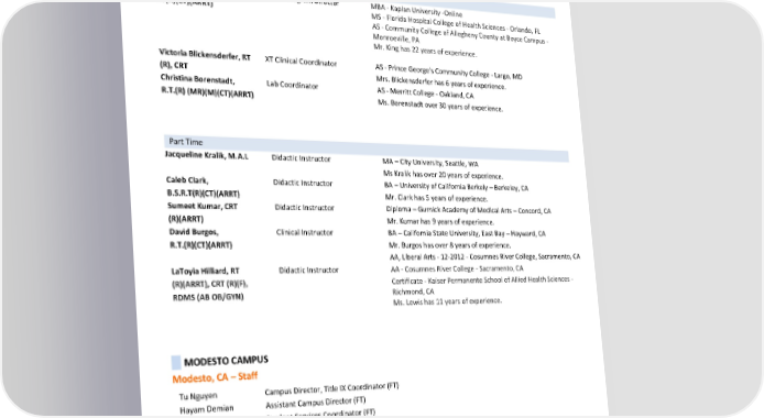 Rachael Ledesma, RN, MSN, Didactic Instructor DNP – Chamberlain University – Addison, IL DNP MSN – University of Texas – Arlington, TX BSN – University of Texas – Arlington, TX ADN – Fresno City College – Fresno, CA Ms. Ledesma has 9 years of experience. Concord, CA – X-Ray Technician with Medical Assistant Skills Program Full Time Jay King, MBA, XTMAS Program Director MBA - Kaplan University -Online RT(R)(CT)(ARRT) MS - Florida Hospital College of Health Sciences - Orlando, FL AS - Community College of Allegheny County at Boyce Campus - Monroeville, PA Mr. King has 22 years of experience. Victoria Blickensderfer, RT XT Clinical Coordinator AS - Prince George's Community College - Largo, MD (R), CRT Mrs. Blickensderfer has 6 years of experience. Christina Borenstadt, Lab Coordinator AS - Merritt College - Oakland, CA R.T.(R) (MR)(M)(CT)(ARRT) Ms. Borenstadt over 30 years of experience. Part Time Jacqueline Kralik, M.A.L Didactic Instructor MA – City University, Seattle, WA Ms Kralik has over 20 years of experience. Caleb Clark, Didactic Instructor BA – University of California Berkely – Berkeley, CA B.S.R.T(R)(CT)(ARRT) Mr. Clark has 5 years of experience. Sumeet Kumar, CRT Didactic Instructor Diploma – Gurnick Academy of Medical Arts – Concord, CA (R)(ARRT) Mr. Kumar has 9 years of experience. David Burgos, Clinical Instructor BA – California State University, East Bay – Hayward, CA R.T.(R)(CT)(ARRT) Mr. Burgos has over 8 years of experience. AA, Liberal Arts - 12-2012 - Cosumnes River College, Sacramento, CA LaToyia Hilliard, RT Didactic Instructor AA - Cosumnes River College - Sacramento, CA (R)(ARRT), CRT (R)(F), Certificate - Kaiser Permanente School of Allied Health Sciences - RDMS (AB OB/GYN) Richmond, CA Ms. Lewis has 11 years of experience. MODESTO CAMPUS Modesto, CA – Staff Tu Nguyen Campus Director, Title IX Coordinator (FT) Hayam Demian Assistant Campus Director (FT) Angel Yang Student Services Coordinator (FT) Annabella Nguyen VN Instructional Aide (PT) Ashley Robinson Admission Advisor (FT) Audra Noppe Student Services Coordinator/Administrative Assistant (FT) Catherina Tregea Front Desk Representative (FT) Deborah Parsons Campus Business Office Coordinator (PT) Estela Rodriguez Student Services Manager (FT) Revised by: Gurnick Academy of Medical Arts Process Department Page 23 of 60 Effective Dates: January 1, 2024, to December 31, 2024 Date of Revision: March 1, 2024