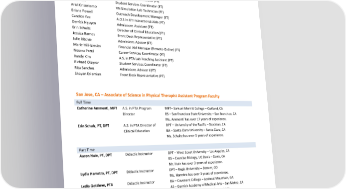 SAN JOSE CAMPUS San Jose, CA – Staff Marc Feldman Campus Director, Title IX Coordinator (FT) Gleb Nikitenko Associate Campus Director (FT) Amy Tran Student Services Coordinator (FT) Ariel Crisostomo VN Simulation Lab Technician (FT) Briana Powell Outreach Development Manager (FT) Candice Yee A.O.S in UT Instructional Aide (PT) Derrick Nguyen Admissions Assistant (PT) Erin Schultz Director of Clinical Education (PT) Jessica Barnes Front Desk Representative (PT) Julie Ritchie Admissions Advisor (FT) Marie Hill-Iglesias Financial Aid Manager (Remote-Online) (FT) Neema Patel Career Services Coordinator (FT) Randy Kim A.S. in PTA Lab Teaching Assistant (PT) Richard Olayvar Student Services Coordinator (FT) Rita Sanchez Admissions Advisor I (FT) Shayan Eslamian Front Desk Representative (PT) San Jose, CA – Associate of Science in Physical Therapist Assistant Program Faculty Full Time Catherine Ammenti, MPT A.S. in PTA Program MPT– Samuel Merritt College – Oakland, CA Director BS – San Francisco State University – San Francisco, CA Ms. Ammenti has over 17 years of experience. Erin Schulz, PT, DPT A.S. in PTA Director of DPT – University of the Pacific – Stockton, CA Clinical Education BA – Santa Clara University – Santa Clara, CA Ms. Schultz has over 5 years of experience. Part Time Aaron Huie, PT, DPT Didactic Instructor DPT – West Coast University – Los Angeles, CA BS – Exercise Biology, UC Davis – Davis, CA Mr. Huie has over 3 years of experience. Lydia Hamstra, PT, DPT Didactic Instructor DPT – Regis University – Denver, CO Ms. Hamstra has over 3 years of experience. Lydia Gottlove, PTA Didactic Instructor BA – Covenant College – Lookout Mountain, GA AS – Gurnick Academy of Medical Arts – San Mateo, CA Ms. Gottlove has over 7 years of experience. An Luong, DPT, BS, PT Didactic Instructor DPT – Mount St Mary's University – Los Angeles, CA BS – San Jose State University – San Jose, CA Mr. Luong has over 5 years of experience. Hilary Register, DPT, BS, Didactic/Clinical Instructor DTP – Chapman University PT BS – San Jose State University – San Jose, CA Revised by: Gurnick Academy of Medical Arts Process Department Page 8 of 60 Effective Dates: January 1, 2024, to December 31, 2024 Date of Revision: March 1, 2024