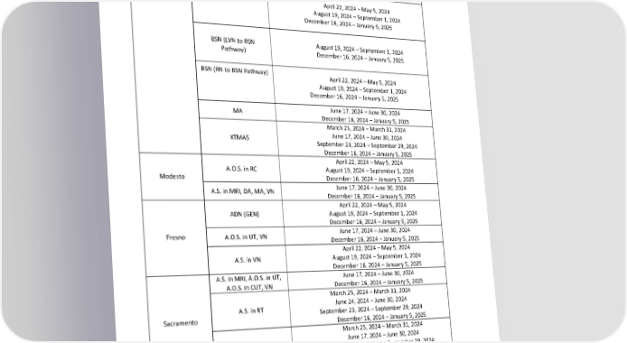 March 25, 2024 – March 31, 2024 June 24, 2024 – June 30, 2024 A.S. in RT September 23, 2024 – September 29, 2024 December 16, 2024 – January 5, 2025 April 22, 2024 – May 5, 2024 BSDMI August 19, 2024 – September 1, 2024 December 16, 2024 – January 5, 2025 BSN April 22, 2024 – May 5, 2024 August 19, 2024 – September 1, 2024 December 16, 2024 – January 5, 2025 BSN (LVN to BSN August 19, 2024 – September 1, 2024 Pathway) December 16, 2024 – January 5, 2025 BSN (RN to BSN Pathway) April 22, 2024 – May 5, 2024 August 19, 2024 – September 1, 2024 December 16, 2024 – January 5, 2025 MA June 17, 2024 – June 30, 2024 December 16, 2024 – January 5, 2025 March 25, 2024 – March 31, 2024 XTMAS June 17, 2024 – June 30, 2024 September 23, 2024 – September 29, 2024 December 16, 2024 – January 5, 2025 April 22, 2024 – May 5, 2024 A.O.S. in RC August 19, 2024 – September 1, 2024 Modesto December 16, 2024 – January 5, 2025 A.S. in MRI, DA, MA, VN June 17, 2024 – June 30, 2024 December 16, 2024 – January 5, 2025 April 22, 2024 – May 5, 2024 ADN (GEN) August 19, 2024 – September 1, 2024 December 16, 2024 – January 5, 2025 Fresno A.O.S. in UT, VN June 17, 2024 – June 30, 2024 December 16, 2024 – January 5, 2025 April 22, 2024 – May 5, 2024 A.S. in VN August 19, 2024 – September 1, 2024 December 16, 2024 – January 5, 2025 A.S. in MRI, A.O.S. in UT, June 17, 2024 – June 30, 2024 A.O.S. in CUT, VN December 16, 2024 – January 5, 2025 March 25, 2024 – March 31, 2024 A.S. in RT June 24, 2024 – June 30, 2024 Sacramento September 23, 2024 – September 29, 2024 December 16, 2024 – January 5, 2025 March 25, 2024 – March 31, 2024 XTMAS June 17, 2024 – June 30, 2024 September 23, 2024 – September 29, 2024 December 16, 2024 – January 5, 2025 Van Nuys A.O.S. in RT July 3, 2023 – July 9, 2023 December 18, 2023 – December 31, 2023 Revised by: Gurnick Academy of Medical Arts Process Department Page 53 of 60 Effective Dates: January 1, 2024, to December 31, 2024 Date of Revision: March 1, 2024