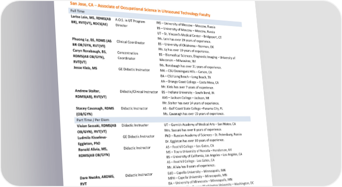 PT– University of Pittsburgh Ms. Register has 10 years of experience Vijay Lakshmi, DPT, PT Assistant Didactic DPT – Rocky Mountain University of Health Professions – Provo, Instructor UT BS – Dr. MGR Medical University, SRMC & PI Chennai – India Mr. Lakshmi has over 20 years of experience. San Jose, CA – Associate of Occupational Science in Ultrasound Technology Faculty Full Time Larisa Lein, MS, RDMS(AB A.O.S. in UT Program MS – University of Moscow – Moscow, Russia BR), RVT(VT), RDCS(AE) Director BS – University of Moscow – Moscow, Russia UT – St. Vincent's Medical Center – Bridgeport, CT Ms. Lein has over 29 years of experience. Phuong Ly, BS, RDMS (AB Clinical Coordinator BS – University of Oklahoma – Norman, OK BR OB/GYN, RVT(VT) Ms. Ly has over 19 years of experience. Caryn Rorabaugh, BS, Concentration BS – Biomedical Sciences, Diagnostic Imaging – University of RDMS(AB OB/GYN), Coordinator Wisconsin – Milwaukee, WI RVT(VT) Ms. Rorabaugh has over 31 years of experience. Jesse Kleis, MS GE Didactic Instructor MA – CSU Dominguez Hills – Carson, CA BA – CSU Long Beach – Long Beach, TX AA – Orange Coast College – Costa Mesa, CA Mr. Kleis has over 7 years of experience. Andrew Stalter, Didactic/Clinical Instructor BS – Indiana University – South Bend, IN RDMS(AB), RVT(VT) AAS – Jackson College – Jackson, MI Mr. Stalter has over 14 years of experience. Stacey Cavanagh, RDMS Didactic Instructor AS - Gulf Coast State College –Panama City, FL (OB/GYN) Ms. Cavanagh has over 15 years of experience. Part Time / Per Diem Vivian Sassaki, RDMS(AB Didactic Instructor UT – Gurnick Academy of Medical Arts – San Mateo, CA OB/GYN), RVT(VT) Mrs. Sassaki has over 8 years of experience. Ludmila Kisseleva- GE Didactic Instructor PhD – Russian Academy of Sciences – St. Petersburg, Russia Eggleton, PhD Dr. Eggleton has over 30 years of experience. Ronald Alivia, MS, Didactic Instructor AS – Foothill College – Los Gatos, CA RDMS(AB OB/GYN) MS – Touro University of Nevada – Henderson, NV BS – University of California, Los Angeles – Los Angeles, CA AS – Foothill College - Los Gatos, CA Mr. Alivia has 8 years of experience. Dare Nwaka, ARDMS, Didactic Instructor EdD – Capella University – Minneapolis, MN RVT MPH – Capella University – Minneapolis, MN BA – University of Minnesota – Minneapolis, MN Certificate – The George Washington University – Washington, DC Ms. Nwaka has 17 years of experience. Narges Kashani, ARDMS Didactic Instructor BS – Islamic Azad University –Tehran, Iran AS – Diablo Valley College – Pleasant Hill, CA ARDMS – Kaiser Permanente School of Allied Health Science – Richmond, CA Ms. Kashani has over 5 years of experience. Revised by: Gurnick Academy of Medical Arts Process Department Page 9 of 60 Effective Dates: January 1, 2024, to December 31, 2024 Date of Revision: March 1, 2024