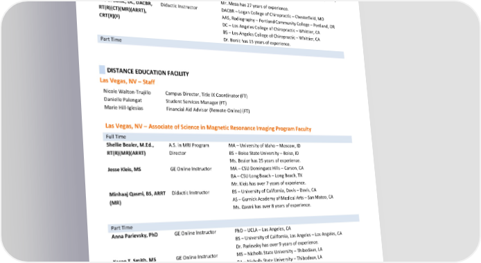 Van Nuys, CA – X-Ray Technician with Medical Assistant Skills Program Faculty Full Time Kristin Beinschroth, PHD XTMAS Program Director PhD – Liberty University – Lynchburg, VA ABD, MPH, BSRS, MPH – California Baptist University – Riverside, CA RT(R)(ARRT), CHES Dr. Beinschroth has over 10 years of experience. Edgar Meza, BS, XT Clinical Coordinator BS – Purdue University Global – Online Diploma - Modern Technology School of X-ray – North Hollywood, CA Mr. Meza has 27 years of experience. Eve E. Bonic, DC, DACBR, Didactic Instructor DACBR – Logan College of Chiropractic – Chesterfield, MO RT(R)(CT)(MR)(ARRT), AAS, Radiography – Portland Community College – Portland, OR CRT(R)(F) DC – Los Angeles College of Chiropractic – Whittier, CA BS – Los Angeles College of Chiropractic – Whittier, CA Dr. Bonic has 15 years of experience. Part Time DISTANCE EDUCATION FACILITY Las Vegas, NV – Staff Nicole Walton-Trujillo Campus Director, Title IX Coordinator (FT) Danielle Palengat Student Services Manager (FT) Marie Hill-Iglesias Financial Aid Advisor (Remote-Online) (FT) Las Vegas, NV – Associate of Science in Magnetic Resonance Imaging Program Faculty Full Time Shellie Bealer, M.Ed., A.S. in MRI Program MA – University of Idaho – Moscow, ID RT(R)(MR)(ARRT) Director BS – Boise State University – Boise, ID Ms. Bealer has 25 years of experience. Jesse Kleis, MS GE Online Instructor MA – CSU Dominguez Hills – Carson, CA BA – CSU Long Beach – Long Beach, TX Mr. Kleis has over 7 years of experience. Minhaaj Qasmi, BS, ARRT Didactic Instructor BS – University of California, Davis – Davis, CA (MR) AS – Gurnick Academy of Medical Arts – San Mateo, CA Ms. Qasmi has over 8 years of experience. Part Time Anna Parievsky, PhD GE Online Instructor PhD – UCLA – Los Angeles, CA BS – University of California, Los Angeles – Los Angeles, CA Dr. Parievsky has over 9 years of experience. Karen T. Smith, MS GE Online Instructor MS – Nicholls State University – Thibodaux, LA BA – Nicholls State University – Thibodaux, LA Mrs. Smith has over 20 years of experience. Mark W. Guay, MS GE Didactic Instructor MS – State University of New York – New Paltz, NY BA – State University of New York – Fredonia, NY Mr. Guay has 12 years of experience. Revised by: Gurnick Academy of Medical Arts Process Department Page 46 of 60 Effective Dates: January 1, 2024, to December 31, 2024 Date of Revision: March 1, 2024