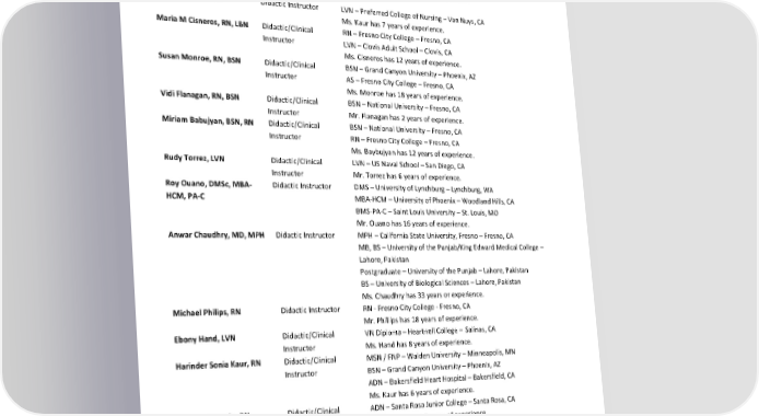 Heather Matthes, RN, BA, VN Program BSN – Gurnick Academy – Concord, CA BSN Coordinator ADN – San Joaquin Valley College – Visalia, CA BA – UC Davis – Davis, CA Ms. Matthes has 7 years of experience. Antonette Hayes, RN Clinical Coordinator ADN – Fresno City College – Fresno, CA Ms. Hayes has 14 years of experience. 56TJasjit (Jessie) Dhaliwal, Nursing Clinical AS – San Joaquin Valley College – Fresno, CA RMA, AAMA Partnership Ms. Dhaliwal has over 16 years of experience. Coordinator Gurpreet Kaur, LVN Didactic Instructor LVN – Preferred College of Nursing – Van Nuys, CA Ms. Kaur has 7 years of experience. Maria M Cisneros, RN, LBN Didactic/Clinical RN – Fresno City College – Fresno, CA Instructor LVN – Clovis Adult School – Clovis, CA Ms. Cisneros has 12 years of experience. Susan Monroe, RN, BSN Didactic/Clinical BSN – Grand Canyon University – Phoenix, AZ Instructor AS – Fresno City College – Fresno, CA Ms. Monroe has 18 years of experience. Vidi Flanagan, RN, BSN Didactic/Clinical BSN – National University – Fresno, CA Instructor Mr. Flanagan has 2 years of experience. Miriam Babujyan, BSN, RN Didactic/Clinical BSN – National University – Fresno, CA Instructor RN – Fresno City College – Fresno, CA Ms. Baybujyan has 12 years of experience. Rudy Torrez, LVN Didactic/Clinical LVN – US Naval School – San Diego, CA Instructor Mr. Torrez has 6 years of experience. Roy Ouano, DMSc, MBA- Didactic Instructor DMS – University of Lynchburg – Lynchburg, WA HCM, PA-C MBA-HCM – University of Phoenix – Woodland Hills, CA BMS-PA-C – Saint Louis University – St. Louis, MO Mr. Ouano has 16 years of experience. Anwar Chaudhry, MD, MPH Didactic Instructor MPH – California State University, Fresno – Fresno, CA MB, BS – University of the Punjab/King Edward Medical College – Lahore, Pakistan Postgraduate – University of the Punjab – Lahore, Pakistan BS – University of Biological Sciences – Lahore, Pakistan Ms. Chaudhry has 33 years or experience. Michael Philips, RN Didactic Instructor RN - Fresno City College - Fresno, CA Mr. Phillips has 18 years of experience. Ebony Hand, LVN Didactic/Clinical VN Diploma – Heartnell College – Salinas, CA Instructor Ms. Hand has 8 years of experience. Harinder Sonia Kaur, RN Didactic/Clinical MSN / FNP – Walden University – Minneapolis, MN Instructor BSN – Grand Canyon University – Phoenix, AZ ADN – Bakersfield Heart Hospital – Bakersfield, CA Ms. Kaur has 6 years of experience. Erin M Arreguin, RN Didactic/Clinical ADN – Santa Rosa Junior College – Santa Rosa, CA Instructor Ms. Arreguin has 7 years of experience. Gurleen Hans, PMHNP, BSN Didactic/Clinical BSN – National University – Fresno, CA Instructor PMHNP – Walden University – Washington Ave S, Minneapolis, MN Ms. Ms. Hans has 3 years of experience. Revised by: Gurnick Academy of Medical Arts Process Department Page 30 of 60 Effective Dates: January 1, 2024, to December 31, 2024 Date of Revision: March 1, 2024