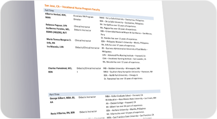 AS – Pima Medical Institute – Denver, CO Mr. Deitch has over 24 years of experience. Kevin Turner, BAS, RT Didactic/Clinical Instructor BAS – Thomas Edison State University – Trenton, NJ Mr. Turner has over 7 years of experience. Karen T. Smith, MS GE Didactic Instructor MS – Nicholls State University – Thibodaux, LA BA – Nicholls State University – Thibodaux, LA Mrs. Smith has over 20 years of experience. San Jose, CA – Vocational Nurse Program Faculty Full Time Alberto Verdad, BSN, Associate VN Program MAN – De La Salle University – Dasmarinas, Philippines MAN Director BSN – De La Salle University – Dasmarinas, Philippines Mr. Verdad has over 32 years of experience. Rebecca Paguyo, LVN Clinical Instructor Ms. Paguyo has over 30 years of experience. Guillermo Paredes, MD, Didactic Instructor MD – Universidad Nacional Mayor de San Marcos – San Marcos, RDMS (AB)(OB), RVT Peru Dr. Paredes has over 15 years of experience. Maria Teresa Norgene D. Clinical Instructor BSN – Philippine Women’s University – Manila, Philippines Erfe, RN Ms. Erfe has over 37 years of experience. Ira Maceda, LVN Didactic/Clinical Instructor BS – Business Administration University of East Manila – Philippines LVN – Advanced Pro Nursing Institute – Hayward, CA CNA – Vocational Nursing Institute – San Leandro, CA Ms. Maceda has over 12 years of experience. Charles Pamatmat, MD, Didactic/Clinical Instructor MD – Walden University – Minneapolis, MN BSN I MHA – Southern New Hampshire University – Hannover, NH BSN – North Park University – Chicago, IL Dr. Pamatmat has over 10 years of experience. Part Time George Gilbert, MBA, BS, Didactic Instructor MBA – Keller Graduate School – Fremont, CA AA BS Education – New Mexico State University – Las Cruses, NM AA – Chabot College – Hayward, CA Mr. Gilbert has over 26 years of experience. Resty Villarina, RN, BSN Didactic Instructor BSN – Arellano University – Manilla, Philippines Mr. Villarina has over 19 years of experience. Cherina Tinio, RN, MSN, Didactic/Clinical Instructor MSN – San Francisco State University – San Francisco, CA BSN BSN – Manila Doctors College of Nursing – Philippines Ms. Tinio has 40 years of experience. Natividad “Gigi” Beckner, Didactic Instructor MSN – San Jose State University – San Jose, CA MSN, BSN BSN – San Juan De Dios College of Nursing – Philippines Msl. Beckner has over 38 years of experience. Revised by: Gurnick Academy of Medical Arts Process Department Page 12 of 60 Effective Dates: January 1, 2024, to December 31, 2024 Date of Revision: March 1, 2024