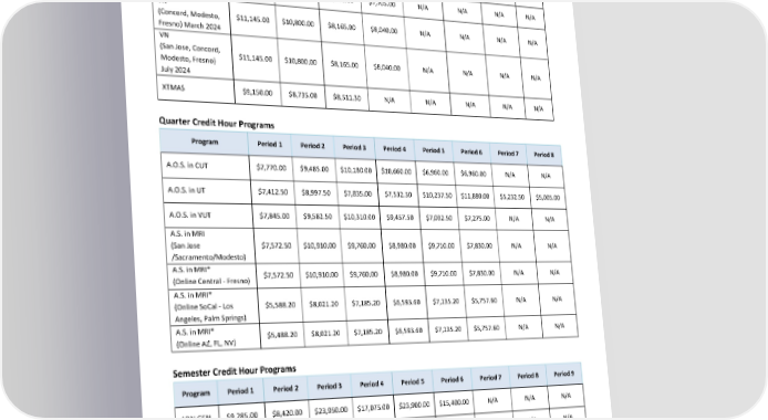 A.S. in PTA $15,412.50 $14,900.00 $7,474.50 $7,474.50 N/A N/A N/A N/A A.S. in RT $10,922.50 $10,375.00 $10,400.00 $10,450.00 $10,550.00 $10,350.00 $6,302.00 N/A Dental Assistant $7,552.50 $7,340.00 N/A N/A N/A N/A N/A N/A Medical Assistant $7,382.50 $7,097.50 N/A N/A N/A N/A N/A N/A VN $10,690.00 $10,350.00 $7,830.00 $7,705.00 N/A N/A N/A N/A (Sacramento) VN (Concord, Modesto, $11,145.00 $10,800.00 $8,165.00 $8,040.00 N/A N/A N/A N/A Fresno) March 2024 VN (San Jose, Concord, $11,145.00 $10,800.00 $8,165.00 $8,040.00 N/A N/A N/A N/A Modesto, Fresno) July 2024 XTMAS $9,150.00 $8,735.00 $8,511.30 N/A N/A N/A N/A N/A Quarter Credit Hour Programs Program Period 1 Period 2 Period 3 Period 4 Period 5 Period 6 Period 7 Period 8 A.O.S. in CUT $7,770.00 $9,485.00 $10,180.00 $10,660.00 $6,960.00 $6,960.00 N/A N/A A.O.S. in UT $7,412.50 $8,997.50 $7,835.00 $7,532.50 $10,237.50 $11,880.00 $5,232.50 $5,005.00 A.O.S. in VUT $7,845.00 $9,582.50 $10,310.00 $9,457.50 $7,032.50 $7,275.00 N/A N/A A.S. in MRI (San Jose $7,572.50 $10,910.00 $9,760.00 $8,980.00 $9,710.00 $7,830.00 N/A N/A /Sacramento/Modesto) A.S. in MRI* $7,572.50 $10,910.00 $9,760.00 $8,980.00 $9,710.00 $7,830.00 N/A N/A (Online Central - Fresno) A.S. in MRI* (Online SoCal - Los $5,588.20 $8,021.20 $7,185.20 $6,593.60 $7,135.20 $5,757.60 N/A N/A Angeles, Palm Springs) A.S. in MRI* $5,488.20 $8,021.20 $7,185.20 $6,593.60 $7,135.20 $5,757.60 N/A N/A (Online AZ, FL, NV) Semester Credit Hour Programs Program Period 1 Period 2 Period 3 Period 4 Period 5 Period 6 Period 7 Period 8 Period 9 ADN GEN $9,285.00 $8,420.00 $23,950.00 $17,075.00 $23,900.00 $15,400.00 N/A N/A N/A ADN AP $33,957.00 $18,950.00 N/A N/A N/A N/A N/A N/A N/A A.S. in VN $10,450.00 $9,700.00 N/A N/A N/A N/A N/A N/A N/A BS in DMI $6,652.50 $6,500.00 $7,700.00 N/A N/A N/A N/A N/A N/A Revised by: Gurnick Academy of Medical Arts Process Department Page 57 of 60 Effective Dates: January 1, 2024, to December 31, 2024 Date of Revision: March 1, 2024