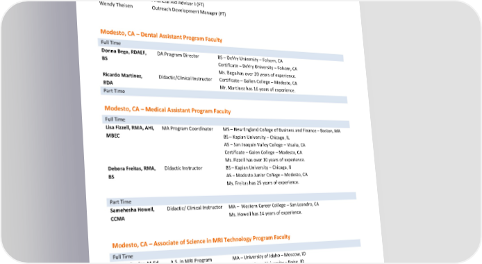 Erika Flores Career Services Coordinator (FT) Felicia De Leon Financial Aid Manager (FT) Kari Rose Admissions Advisor (FT) Karina Zaragosa Administrative Support (FT) Kylie Webb VN Instructional Aide (FT) Molly Vin Admissions Assistant (FT) Nina Kruis Admissions Advisor (PT) Panhia Vang Financial Aid Assistant (FT) Sharanji Jimenez Instructional Aide (PT) Wajeha Hussain Financial Aid Advisor I (FT) Wendy Theisen Outreach Development Manager (FT) Modesto, CA – Dental Assistant Program Faculty Full Time Donna Bega, RDAEF, DA Program Director BS – DeVry University – Folsom, CA BS Certificate – DeVry University – Folsom, CA Ms. Bega has over 20 years of experience. Ricardo Martinez, Didactic/Clinical Instructor Certificate – Gallen College – Modesto, CA RDA Mr. Martinez has 16 years of experience. Part Time Modesto, CA – Medical Assistant Program Faculty Full Time Lisa Fizzell, RMA, AHI, MA Program Coordinator MS – New England College of Business and Finance – Boston, MA MBEC BS – Kaplan University – Chicago, IL AS – San Joaquin Valley College – Visalia, CA Certificate – Galen College – Modesto, CA Ms. Fizzell has over 10 years of experience. Debora Freitas, RMA, Didactic Instructor BS – Kaplan University – Chicago, Il BS AS – Modesto Junior College – Modesto, CA Ms. Freitas has 25 years of experience. Part Time Samehesha Howell, Didactic/ Clinical Instructor MA – Western Career College – San Leandro, CA CCMA Ms. Howell has 24 years of experience. Modesto, CA – Associate of Science in MRI Technology Program Faculty Full Time Shellie Bealer, M.Ed., A.S. in MRI Program MA – University of Idaho – Moscow, ID RT(R)(MR)(ARRT) Director BS – Boise State University – Boise, ID Ms. Bealer has 25 years of experience. Rochelle Augustine, Clinical Coordinator BS – Siena Heights University – Adrian, MI BS, ARRT AS – Kaiser Permanente School of Allied Health Science – Richmond, CA Ms. Augustine has 6 years of experience. Revised by: Gurnick Academy of Medical Arts Process Department Page 24 of 60 Effective Dates: January 1, 2024, to December 31, 2024 Date of Revision: March 1, 2024