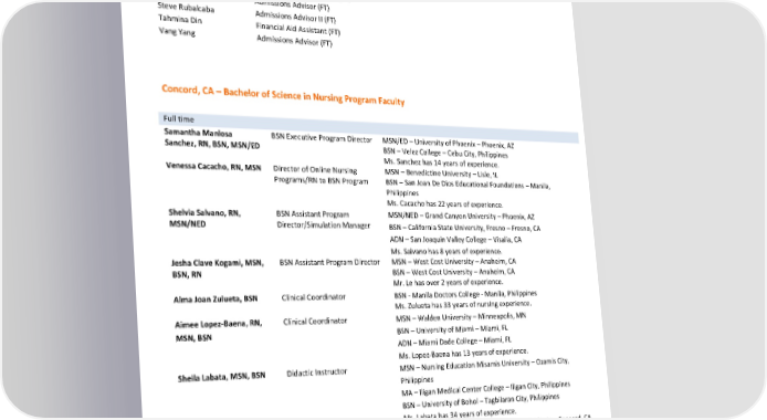 Maricar Sun Front Desk Representative (FT) Mary Evangeline Espino BSN Faculty Support (PT) Mary Young Financial Aid Assistant (FT) Melissa Gil Student Services Coordinator (FT) Paniz Deris Career Services Coordinator (FT) Phuong Nguyen Financial Aid Advisor II (FT) Regina Chu ASRT Lab Assistant (PT) Robin Adhikari VN Faculty Support (PT) Seira Gavino Front Desk Representative (FT) Steven Brown Admissions Advisor (FT) Steve Rubalcaba Admissions Advisor II (FT) Tahmina Din Financial Aid Assistant (FT) Vang Yang Admissions Advisor (FT) Concord, CA – Bachelor of Science in Nursing Program Faculty Full time Samantha Manlosa BSN Executive Program Director MSN/ED – University of Phoenix – Phoenix, AZ Sanchez, RN, BSN, MSN/ED BSN – Velez College – Cebu City, Philippines Ms. Sanchez has 14 years of experience. Venessa Cacacho, RN, MSN Director of Online Nursing MSN – Benedictine University – Lisle, IL Programs/RN to BSN Program BSN – San Joan De Dios Educational Foundations – Manila, Philippines Ms. Cacacho has 22 years of experience. Shelvia Salvano, RN, BSN Assistant Program MSN/NED – Grand Canyon University – Phoenix, AZ MSN/NED Director/Simulation Manager BSN – California State University, Fresno – Fresno, CA ADN – San Joaquin Valley College – Visalia, CA Ms. Salvano has 8 years of experience. Jesha Clave Kogami, MSN, BSN Assistant Program Director MSN – West Cost University – Anaheim, CA BSN, RN BSN – West Cost University – Anaheim, CA Mr. Le has over 2 years of experience. Alma Joan Zulueta, BSN Clinical Coordinator BSN - Manila Doctors College - Manila, Philippines Ms. Zulueta has 33 years of nursing experience. Aimee Lopez-Baena, RN, Clinical Coordinator MSN – Walden University – Minneapolis, MN MSN, BSN BSN – University of Miami – Miami, FL ADN – Miami Dade College – Miami, FL Ms. Lopez-Baena has 13 years of experience. Sheila Labata, MSN, BSN Didactic Instructor MSN – Nursing Education Misamis University – Ozamis City, Philippines MA – Iligan Medical Center College – Iligan City, Philippines BSN – University of Bohol – Tagbilaran City, Philippines Ms. Labata has 34 years of experience. Tia Chanthavong, BSN, Didactic Instructor MSN in progess – Gurnick Academy of Medical Arts – Concord, CA MSN BSN – University of Phoeniz – Tempe, Arizona Diploma – Gurnick Academy of Medical Arts – Modesto, Ca Mr. Chanthavon has 9 years of experience. Revised by: Gurnick Academy of Medical Arts Process Department Page 14 of 60 Effective Dates: January 1, 2024, to December 31, 2024 Date of Revision: March 1, 2024
