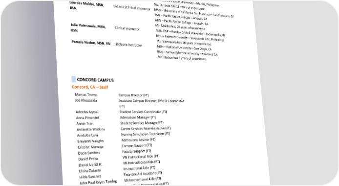 Mercedes German, RN, Didactic Instructor MSN – San Francisco State University – San Francisco, CA MSN Ms. German has over 20 years of experience. Be Pongbandith, LVN Clinical Instructor BA – California State University, Stanislaus – Turlock, CA Mr. Pongbandith has 15 years of experience. Maria Luisa Cruz Didactic Instructor MSN- San Francisco State University – San Francisco, CA BSN – Saint Louis University – Baguio City, Philippines Ms. Cruz has 30 years of experience. Cecilia Durante, MSN, Didactic/Clinical Instructor MSN – University of Phoenix – Phoenix, AZ BSN BSN –Centro Escolar University – Manila, Philippines Ms. Durante has 13 years of experience Lourdes Moldre, MSN, Didactic/Clinical Instructor MSN – University of California San Francisco – San Francisco, CA BSN, BSN – Pacific Union College – Angwin, CA ADN – Pacific Union College – Angwin, CA Ms. Moldre has 20 years of experience Julie Valenzuela, MSN, Clinical Instructor MSN-FNP – Purdue Global University – Indianapolis, IN BSN BSN – Fatima University – Valenzuela City, Philippines Ms. Valenzuela has 20 years of experience. Pamela Nacion, MSN, RN Didactic Instructor MSN – National University – San Diego, CA BSN – Samuel Merritt University – Oakland, CA Ms. Nacion has 3 years of experience CONCORD CAMPUS Concord, CA – Staff Marcus Tromp Campus Director (FT) Joe Kheuasida Assistant Campus Director; Title IX Coordinator (FT) Adeeba Aqmal Student Services Coordinator (FT) Anna Pimentel Admissions Manager (FT) Annie Tran Student Services Manager (FT) Antinette Watkins Career Services Representative (FT) Aristotle Lara Nursing Simulation Technician (FT) Breyanni Vaughn Admissions Advisor (FT) Cristine Abenoja Campus Support (PT) Dacia Sanders Faculty Support (FT) Daniel Preza VN Instructional Aide (PT) David Alarid Jr. VN Instructional Aide (PT) Elisha Zulueta Instructional Aide (FT) Hilda Sanchez Financial Aid Assistant (FT) John Paul Reyes Tandog VN Instructional Aide (PT) Juan Anchores Front Desk Representative (FT) Kristen Pinkerton Financial Aid Manager (FT) Krystiana Roan Associate Admissions Advisor (FT) Lea Boe Director of Partnership & Development in Nursing (FT) Lucy Cordova Financial Aid Advisor (FT) Maria Alfonso Student Services Coordinator (FT) Revised by: Gurnick Academy of Medical Arts Process Department Page 13 of 60 Effective Dates: January 1, 2024, to December 31, 2024 Date of Revision: March 1, 2024