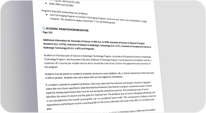 Students who graduate from one Gurnick program and enroll in additional programs may qualify for an alumni grant or scholarship as specified by Gurnick Academy of Medical Arts. The grants or scholarships are tied to specific programs, and the amount of grant or scholarship given per program varies. Please speak with an Admissions Advisor for details. Programs that offer alumni grants are as follows: ● BSDMI: RT Grad ($2,000) ● LVN-ADN: VN Grad ($16,468) ● LVN-BSN Program: VN Grad ($19,000); ASVN Grad ($3,000) ● RN-BSN Program: ADN Grad ($1,800) ● VN Program: MA Grad ($1,500) ● MSN: BSN Grad ($1,800) Programs that offer scholarships are as follows: ● Any Full Imaging Program to Another Full Imaging Program: Varies per year with a max of $10,000 for a single st recipient. The deadline to apply is December 1 for the following year. ACADEMIC PROBATION/REMEDIATION Page 159 Additional information for Associate of Science in MRI (A.S. in MRI), Associate of Science in Physical Therapist Assistant (A.S. in PTA), Associate of Science in Radiologic Technology (A.S. in RT), Associate of Occupational Science in Radiologic Technology (A.O.S. in RT) and Programs Students in the Associate of Science in Radiologic Technology Program, Associate of Occupational Science in Radiologic Technology Program, and Associate of Nuclear Medicine Technology Program may be placed on remediation only for a maximum of 2 courses per module and are not to exceed the total of two (2) times throughout the entire duration of the program. Students may be placed on academic probation during any course (didactic, lab, or clinical evaluations) if their final score is 60% or greater. Students who score below 60% are not eligible for remediation. If a student is placed on academic probation, they must meet with the instructor and Program Director or designee within the time frame specified in table Remediation/Probation Plan Details to prepare a probationary plan of action explicitly stating expectations that must be met during the probationary period. The probationary plan of action identifies the areas of concern and the goals for improvement. The probation plan of action is designed individually and is not calculated into the overall course grade, nor is it considered “extra credit.” The consequence of failing to meet the expectations and failing to receive a passing grade for the course ultimately will result in the offer of a remedial action plan. An improvement plan will be initiated with specific due dates. Academic probationary status is lifted once the student has met the expectations defined within the probationary plan of action and completed the course in satisfactory academic standing. The student receives a final passing grade for the course after being placed on probation. This final grade will be reflected on the student’s transcript. Revised by: Gurnick Academy of Medical Arts Process Department Page 49 of 60 Effective Dates: January 1, 2024, to December 31, 2024 Date of Revision: March 1, 2024