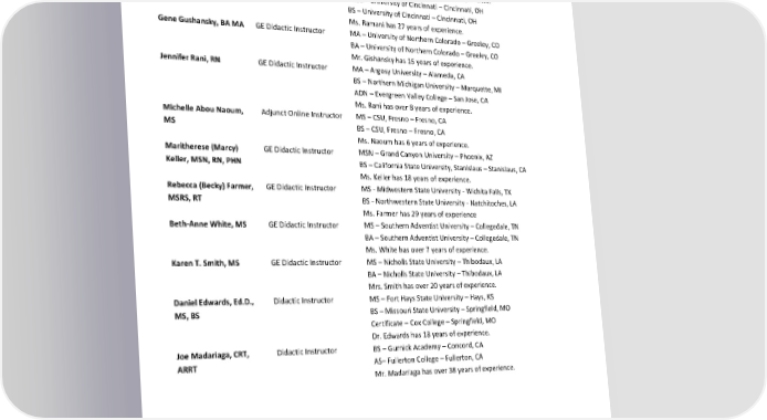 Steven Visniski, BEE, GE Didactic Instructor BEE – Penn State University – State College, PA MBA, DrBA MBA – University of Phoenix – Online DrBA – University of Phoenix – Online Mr. Visniski has over 12 years of experience. Sanjana Krishnamurthy, GE Didactic Instructor MS – California State University – Fresno, CA M.Sc, MS, M.Sc – University of Mysore – Mysore, India B.Sc – University of Mysore – Mysore, India Ms. Krishnamurthy has over 2 years of experience. Anita Ramani, BS, M.Ed GE Didactic Instructor M.Ed – University of Cincinnati – Cincinnati, OH BS – University of Cincinnati – Cincinnati, OH Ms. Ramani has 27 years of experience. Gene Gushansky, BA MA GE Didactic Instructor MA – University of Northern Colorado – Greeley, CO BA – University of Northern Colorado – Greeley, CO Mr. Gishansky has 15 years of experience. Jennifer Rani, RN GE Didactic Instructor MA – Argosy University – Alameda, CA BS – Northern Michigan University – Marquette, MI ADN – Evergreen Valley College – San Jose, CA Ms. Rani has over 8 years of experience. Michelle Abou Naoum, Adjunct Online Instructor MS – CSU, Fresno – Fresno, CA MS BS – CSU, Fresno – Fresno, CA Ms. Naoum has 6 years of experience. Maritherese (Marcy) GE Didactic Instructor MSN – Grand Canyon University – Phoenix, AZ Keller, MSN, RN, PHN BS – California State University, Stanislaus – Stanislaus, CA Ms. Keller has 18 years of experience. Rebecca (Becky) Farmer, GE Didactic Instructor MS - Midwestern State University - Wichita Falls, TX MSRS, RT BS - Northwestern State University - Natchitoches, LA Ms. Farmer has 29 years of experience Beth-Anne White, MS GE Didactic Instructor MS – Southern Adventist University – Collegedale, TN BA – Southern Adventist University – Collegedale, TN Ms. White has over 7 years of experience. Karen T. Smith, MS GE Didactic Instructor MS – Nicholls State University – Thibodaux, LA BA – Nicholls State University – Thibodaux, LA Mrs. Smith has over 20 years of experience. Daniel Edwards, Ed.D., Didactic Instructor MS – Fort Hays State University – Hays, KS MS, BS BS – Missouri State University – Springfield, MO Certificate – Cox College – Springfield, MO Dr. Edwards has 18 years of experience. Joe Madariaga, CRT, Didactic Instructor BS – Gurnick Academy – Concord, CA ARRT AS– Fullerton College – Fullerton, CA Mr. Madariaga has over 38 years of experience. Revised by: Gurnick Academy of Medical Arts Process Department Page 47 of 60 Effective Dates: January 1, 2024, to December 31, 2024 Date of Revision: March 1, 2024