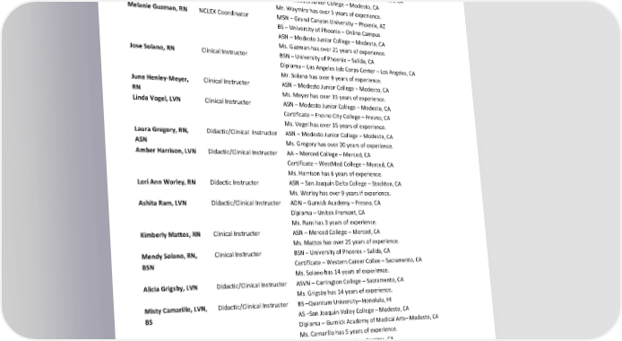 Bennie Baca, BSN, VN Program Coordinator BSN – University of Phoenix – Salida, CA LVN Certificate – Emanuel Turlock VN Program – Turlock, CA Mr. Baca has over 20 years of experience. Jaynesh Singh, LVN Clinical Coordinator AA – Modesto Junior College – Modesto, CA Certificate – Modesto Junior College – Modesto, CA Mr. Singh has over 16 years of experience. Philip Waymire, LVN NCLEX Integration LVN – Career Networks Institute – Orange, CA Manager/Simulation BA – California State University Stanislaus – Turlock, CA Instructor AA – Modesto Junior College – Modesto, CA Mr. Waymire has over 5 years of experience. Melanie Guzman, RN NCLEX Coordinator MSN – Grand Canyon University – Phoenix, AZ BS – University of Phoenix – Online Campus ASN – Modesto Junior College – Modesto, CA Ms. Guzman has over 21 years of experience. Jose Solano, RN Clinical Instructor BSN – University of Phoenix – Salida, CA Diploma – Los Angeles Job Corps Center – Los Angeles, CA Mr. Solano has over 9 years of experience. June Henley-Meyer, Clinical Instructor ASN – Modesto Junior College – Modesto, CA RN Ms. Meyer has over 35 years of experience. Linda Vogel, LVN Clinical Instructor ASN – Modesto Junior College – Modesto, CA Certificate – Fresno City College – Fresno, CA Ms. Vogel has over 35 years of experience. Laura Gregory, RN, Didactic/Clinical Instructor ASN – Modesto Junior College – Modesto, CA ASN Ms. Gregory has over 20 years of experience. Amber Harrison, LVN Didactic/Clinical Instructor AA – Merced College – Merced, CA Certificate – WestMed College – Merced, CA Ms. Harrison has 6 years of experience. Lori Ann Worley, RN Didactic Instructor ASN – San Joaquin Delta College – Stockton, CA Ms. Worley has over 9 years if experience. Ashita Ram, LVN Didactic/Clinical Instructor ADN – Gurnick Academy – Fresno, CA Diploma – Unitek Fremont, CA Ms. Ram has 3 years of experience. Kimberly Mattos, RN Clinical Instructor ASN – Merced College – Merced, CA Ms. Mattos has over 25 years of experience. Mendy Solano, RN, Clinical Instructor BSN – University of Phoenix – Salida, CA BSN Certificate – Western Career Collee – Sacramento, CA Ms. Solano has 14 years of experience. Alicia Grigsby, LVN Didactic/Clinical Instructor ASVN – Carrington College – Sacramento, CA Ms. Grigsby has 14 years of experience. Misty Camarillo, LVN, Didactic/Clinical Instructor BS –Quantum University– Honolulu, HI BS AS –San Joaquin Valley College – Modesto, CA Diploma – Gurnick Academy of Medical Arts– Modesto, CA Ms. Camarillo has 5 years of experience. Maryjane Castrence, Didactic/Clinical Instructor BS – Fremont University – Cerritos, CA LVN, BS AS– Carrington College California – Sacramento, CA Ms. Castrence has 19 years of experience. Revised by: Gurnick Academy of Medical Arts Process Department Page 26 of 60 Effective Dates: January 1, 2024, to December 31, 2024 Date of Revision: March 1, 2024