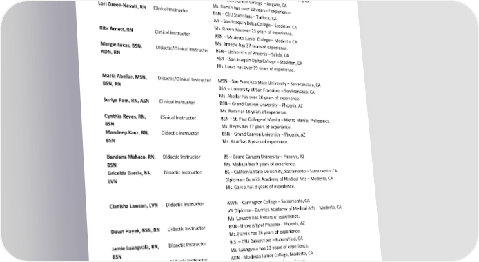 Part Time Debra Marks, RN Didactic/Clinical Instructor AAS – University of New York – Albany, NY Ms. Marks has over 31 years of experience. 56TAksorn Sinlapaxay, Clinical Instructor BSN – University of Phoenix – Sacramento, CA RN ASN – Modesto Junior College – Modesto, CA Ms. Sinlapaxay has over 12 years of experience. Stacie Dahlin, RN Didactic Instructor MSN – Western Governors University – Online Campus BSN – Western Governors University – Online Campus ASN – Pacific Union College – Angwin, CA Ms. Dahlin has over 22 years of experience. Lori Green-Nevatt, RN Clinical Instructor BSN – CSU Stanislaus – Turlock, CA AA – San Joaquin Delta College – Stockton, CA Ms. Green has over 23 years of experience. Rita Arnett, RN Clinical Instructor ASN – Modesto Junior College – Modesto, CA Ms. Arnette has 37 years of experience. Margie Lucas, BSN, Didactic/Clinical Instructor BSN – University of Phoenix – Salida, CA ADN, RN ASN – San Joaquin Delta College – Stockton, CA Ms. Lucas has over 19 years of experience. Maria Abellar, MSN, Didactic/Clinical Instructor MSN – San Francisco State University – San Francisco, CA BSN, RN BSN – University of San Francisco – San Francisco, CA Ms. Abellar has over 20 years of experience. Suriya Ram, RN, ASN Clinical Instructor BSN – Grand Canyon University – Phoenix, AZ Ms. Ram has 18 years of experience. Cynthia Reyes, RN, Clinical Instructor BSN – St. Paul College of Manila – Metro Manila, Philippines BSN Ms. Reyes has 17 years of experience. Mandeep Kaur, RN, Didactic Instructor BSN – Grand Canyon University – Phoenix, AZ BSN Ms. Kaur has 8 years of experience. Bandana Mahato, RN, Didactic Instructor BS – Grand Canyon University – Phoenix, AZ BSN Ms. Mahato has 9 years of experience. Gricelda Garcia, BS, Didactic Instructor BS – California State University, Sacramento – Sacramento, CA LVN Diploma – Gurnick Academy of Medical Arts – Modesto, CA Ms. Garcia has 3 years of experience. Clanisha Lawson, LVN Didactic Instructor ASVN – Carrington College – Sacramento, CA VN Diploma – Gurnick Academy of Medical Arts – Modesto, CA Ms. Lawson has 8 years of experience. Dawn Hayek, BSN, RN Didactic Instructor BSN - University of Phoenix - Phoenix, AZ Ms. Hayek has 16 years of experience. Jamie Luangvala, RN, Didactic Instructor B.S. – CSU Bakersfield – Bakersfield, CA BSN Ms. Luangvala has 13 years of experience. Shannon Saldivar, RN Didactic Instructor ADN - Modesto Junior College, Modesto, CA Ms. Saldivar has 21 years of experience. Francisca Alvarez, Clinical Instructor BS - Western Governors University - Millcreek, UT BSN, BS, AS AS - Merced College - Merced, CA Ms. Alvarez has 4 years of experience. Karem Sanchez, LVN Clinical Instructor AA - Merced College - Merced, CA Ms. Sanchez has 8 years of experience. Revised by: Gurnick Academy of Medical Arts Process Department Page 27 of 60 Effective Dates: January 1, 2024, to December 31, 2024 Date of Revision: March 1, 2024