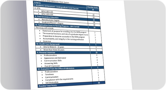 CHANGES & UPDATES TO PUBLISHED INFORMATION ADDITIONAL ADMISSION REQUIREMENTS PER PROGRAM Master of Science in Nursing Program (BSN to MSN Pathway) Page 54 Table 17. BSN to MSN Admission Point System Criteria Possible Points I. Academic Achievement: Undergraduate Level Courses 20 A. GPA • GPA 3.00-3.59 10 • GPA 3.60-4.00 20 II. Post-Secondary Education 20 • Baccalaureate Degree 10 • Graduate/Master’s Degree 20 III. Application Essay to Nursing Program – APA Format 10 The essay will include: • Statement of purpose for enrolling into the MSN program 2 • The essential functions and role of a graduate degree nurse 2 • Preparation to become successful in the MSN program 2 • Accountability and integrity in the nursing profession 2 • Grammar 2 IV. Health Care Background 5 • One to three (1 – 3) years 3 • More than three (3) years 5 V. Personal Interview 20 • Professionalism 4 • Appearance and Demeanor 4 • Communication Skills 4 • Answering Skills 4 • Overall Impression 4 VI. Evaluation from the Office of Admissions 5 • Professionalism 1 • Timeliness 1 • Communication 1 • Compliance with the requirements 1 • Self-Motivation 1 Possible Total Points: 80 ALUMNI GRANTS & SCHOLARSHIP Page 95 Revised by: Gurnick Academy of Medical Arts Process Department Page 48 of 60 Effective Dates: January 1, 2024, to December 31, 2024 Date of Revision: March 1, 2024