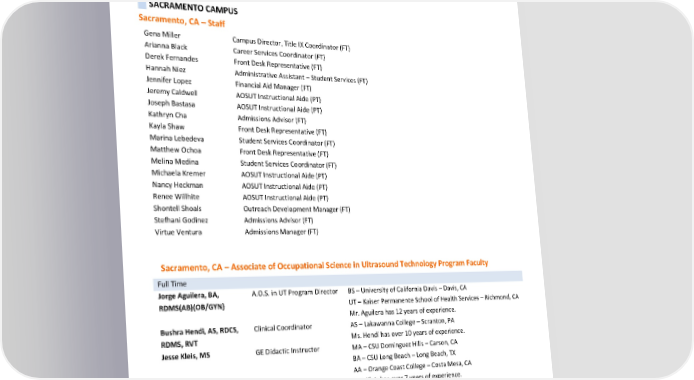 Patricia Silva, RN, MA Clinical Instructor MA – West Coast University – Anaheim, CA ADN – Fresno City College – Fresno, CA Ms. Silva has 18 years of experience. Tarisha Saini, DNP, MSN, ADN Didactic /Clinical DNP – Grand Canyon University – Phoenix, AZ RN Instructor MSN/ RN – California State University – Fresno, CA Ms. Saini has 13 years of experience. SACRAMENTO CAMPUS Sacramento, CA – Staff Gena Miller Campus Director, Title IX Coordinator (FT) Arianna Black Career Services Coordinator (FT) Derek Fernandes Front Desk Representative (FT) Hannah Niez Administrative Assistant – Student Services (FT) Jennifer Lopez Financial Aid Manager (FT) Jeremy Caldwell AOSUT Instructional Aide (PT) Joseph Bastasa AOSUT Instructional Aide (PT) Kathryn Cha Admissions Advisor (FT) Kayla Shaw Front Desk Representative (FT) Marina Lebedeva Student Services Coordinator (FT) Matthew Ochoa Front Desk Representative (FT) Melina Medina Student Services Coordinator (FT) Michaela Kremer AOSUT Instructional Aide (PT) Nancy Heckman AOSUT Instructional Aide (PT) Renee Willhite AOSUT Instructional Aide (PT) Shontell Shoals Outreach Development Manager (FT) Stefhani Godinez Admissions Advisor (FT) Virtue Ventura Admissions Manager (FT) Sacramento, CA – Associate of Occupational Science in Ultrasound Technology Program Faculty Full Time Jorge Aguilera, BA, A.O.S. in UT Program Director BS – University of California Davis – Davis, CA RDMS(AB)(OB/GYN) UT – Kaiser Permanente School of Health Services – Richmond, CA Mr. Aguilera has 12 years of experience. Bushra Hendi, AS, RDCS, Clinical Coordinator AS – Lakawanna College – Scranton, PA RDMS, RVT Ms. Hendi has over 10 years of experience. Jesse Kleis, MS GE Didactic Instructor MA – CSU Dominguez Hills – Carson, CA BA – CSU Long Beach – Long Beach, TX AA – Orange Coast College – Costa Mesa, CA Mr. Kleis has over 7 years of experience. Iana Asenova, Didactic Instructor BS – SUNY Downstate Medical Center – Brooklyn, NY RDMS(AB)(OB/GYN), Ms. Asenova has 5 years of experience. RDCS(AE), RVT(VT) Marie Donahue, RDMS Didactic/Lab Instructor AADMS – Montgomery College – Maryland, MD (AB), RVT(VT) BA – Shippensburg University – Shippensburg, PA Revised by: Gurnick Academy of Medical Arts Process Department Page 37 of 60 Effective Dates: January 1, 2024, to December 31, 2024 Date of Revision: March 1, 2024