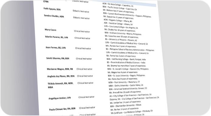 VN Diploma – State University of New York – New York, NY Ms. Lostocco has 12 years of experience. Christin Mathew, BSN, RN Didactic/Clinical Instructor BSN – Rutgers University – Newark, NJ Ms. Mathew has 9 years of experience. Emanuela Asandei, LVN Clinical Instructor BA – Babes Bolyai University – Chuj-Napoca, Romania Diploma – Gurnick Academy of Medical Arts - Concord, CA Ms. Asandei has 10 years of nursing experience. Part Time Scott Wallace, RN CCRN, Didactic Instructor ADN – De Anza College – Cupertino, CA CFRN BSN – Pacific Union College – Cupertino, CA Mr. Wallace has 27 years of experience. Faith Syquia, BSN Didactic Instructor BSN – Lyceum Northwestern University – Dagupcn, Philippines Ms. Syquia has 31 years of experience. Sandra Chubbs, ADN Didactic Instructor ADN – Regents College – Albany, NY ASN – Excelsior College – Albany, NY LVN – Casa Loma College – Los Angeles, CA Ms. Chubbs has 18 years of experience. Mary Casco Clinical Instructor BSN – Arellano University – Manila, Philippines Ms. Casco has over 30 years of experience. Ederlin Pareno, BS, LVN Clinical Instructor BS – University of Phoenix – Phoenix, AZ LVN – Gurnick Academy of Medical Arts – Concord, CA Mrs. Pareno has 2 years of experience. Joan Fermo, BS, LVN Clinical Instructor BS – Philippine School of Business Administration – Philippines LVN – Gurnick Academy of Medical Arts – Concord, CA Ms. Fermo has 2 years of experience. Smriti Sharma, RN, BSN Clinical Instructor BSN – Ved Nursing College – Baroli, Panipat, India BS – Prem Institution of Medical Sciences – India Ms. Sharma has more than 7 years of experience. Marianne Magno, BSN, RN Clinical Instructor BSN – St. Joseph’s College – Quezon City, Philippines Ms. Magno has 4 years of experience. Anghela Joy Flores, RN, BSN Clinical Instructor BSN – St. Louis University – Baguio, Philippines. Ms. Flores has 9 years of experience. Titilola Amendt, RN, MSN, Clinical Instructor MSN – Post University – Waterbury, CT MBA MBA – DeVry University – Castro Valley, CA BSN – American Sentinel University -Denver, CO Ms. Amendt has 18 years of experience. Angelique Jordan, LVN Clinical Instructor AS – City College of San Francisco – San Francisco, CA Diploma, VN – City College of San Francisco – San Francisco, CA Ms. Jordan has 14 years of experience. Paula Chinwe Ibe, RN, BSN Clinical Instructor BSN – Chamberlain University – Illinois Ms. Ibe has 14 years of experience. Lateefah Anderson, LVN Clinical Instructor VN Certificate – Los Medanos College – Pittsburg, CA AS – Los Medanos College – Pittsburg, CA Ms. Anderson has 14 years of experience. Elisa Alviar, LVN, BSN Clinical Instructor BSN – Lorma Colleges – San Fernando, Philippines Ms. Elisa has 2 years of experience. Mariedelle Santella, LVN Clinical Instructor LVN – Medical Career College – Fremont, CA ASVN – Unitek College Medical Career College – Fremont, CA Revised by: Gurnick Academy of Medical Arts Process Department Page 20 of 60 Effective Dates: January 1, 2024, to December 31, 2024 Date of Revision: March 1, 2024