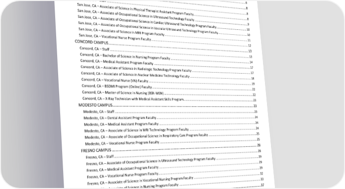 TABLE OF CONTENTS FACULTY AND STAFF ..................................................................................................................................................4 CORPORATE OFFICE STAFF .................................................................................................................................................. 4 PROGRAM DIRECTORS AND SUPERVISORS ......................................................................................................................... 6 Online Staff ....................................................................................................................................................................................... 6 Online Faculty ................................................................................................................................................................................... 6 SAN JOSE CAMPUS .............................................................................................................................................................. 8 San Jose, CA – Staff ........................................................................................................................................................................... 8 San Jose, CA – Associate of Science in Physical Therapist Assistant Program Faculty ...................................................................... 8 San Jose, CA – Associate of Occupational Science in Ultrasound Technology Faculty ..................................................................... 9 San Jose, CA – Associate of Occupational Science in Cardiac Ultrasound Technology Program Faculty ........................................ 10 San Jose, CA – Associate of Occupational Science in Vascular Ultrasound Technology Program Faculty ...................................... 10 San Jose, CA – Associate of Science in MRI Program Faculty .......................................................................................................... 11 San Jose, CA – Vocational Nurse Program Faculty .......................................................................................................................... 12 CONCORD CAMPUS ........................................................................................................................................................... 13 Concord, CA – Staff ......................................................................................................................................................................... 13 Concord, CA – Bachelor of Science in Nursing Program Faculty ..................................................................................................... 14 Concord, CA – Medical Assistant Program Faculty ......................................................................................................................... 17 Concord, CA – Associate of Science in Radiologic Technology Program Faculty ............................................................................ 17 Concord, CA – Associate of Science in Nuclear Medicine Technology Faculty ............................................................................... 18 Concord, CA – Vocational Nurse (VN) Faculty ................................................................................................................................. 19 Concord, CA – BSDMI Program (Online) Faculty ............................................................................................................................. 22 Concord, CA – Master of Science in Nursing (BSN-MSN) ................................................................................................................ 22 Concord, CA – X-Ray Technician with Medical Assistant Skills Program ......................................................................................... 23 MODESTO CAMPUS........................................................................................................................................................... 23 Modesto, CA – Staff ........................................................................................................................................................................ 23 Modesto, CA – Dental Assistant Program Faculty ........................................................................................................................... 24 Modesto, CA – Medical Assistant Program Faculty ........................................................................................................................ 24 Modesto, CA – Associate of Science in MRI Technology Program Faculty ..................................................................................... 24 Modesto, CA – Associate of Occupational Science in Respiratory Care Program Faculty .............................................................. 25 Modesto, CA – Vocational Nurse Program Faculty ......................................................................................................................... 25 FRESNO CAMPUS .............................................................................................................................................................. 28 Fresno, CA – Staff ............................................................................................................................................................................ 28 Fresno, CA – Associate of Occupational Science in Ultrasound Technology Program Faculty ....................................................... 29 Fresno, CA – Medical Assistant Program Faculty ............................................................................................................................ 29 Fresno, CA – Vocational Nurse Program Faculty ..................................................................................................