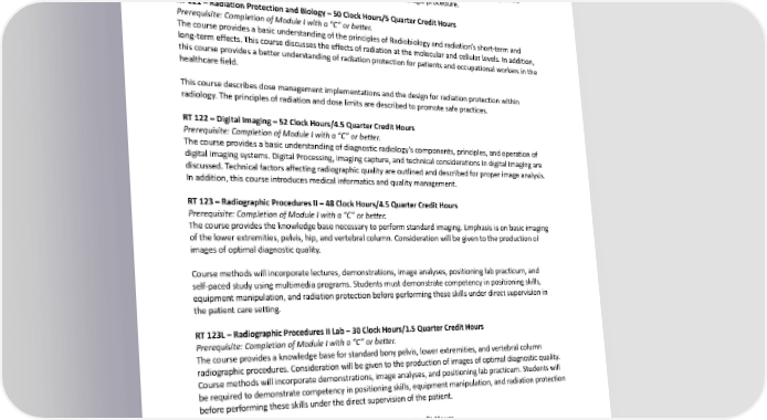 RT120C–ClinicalPracticeII–168ClockHours/5.5QuarterCredits Prerequisite: Completion of Module I with a “C” or better. Clinical experiences are designed to provide patient care and assessment, competent performance of radiologic imaging, and total quality management. Team practice, patient-centered clinical practice, and professional developmentareevaluatedthroughstructured,competency-basedclinicalassignments.Competencylevels ensurethepatient’s well-being before, during, and following the radiologic procedure. RT121–RadiationProtectionandBiology–50ClockHours/5QuarterCreditHours Prerequisite: Completion of Module I with a “C” or better. ThecourseprovidesabasicunderstandingoftheprinciplesofRadiobiologyandradiation’sshort-termand long-term effects. This course discusses the effects of radiation at the molecular and cellular levels. In addition, this course provides a better understanding of radiation protection for patients and occupational workers in the healthcare field. This course describes dose management implementations and the design for radiation protection within radiology. The principles of radiation and dose limits are described to promote safe practices. RT122–DigitalImaging–52ClockHours/4.5QuarterCreditHours Prerequisite: Completion of Module I with a “C” or better. Thecourseprovidesabasicunderstandingofdiagnosticradiology’scomponents,principles,andoperationof digital imaging systems. Digital Processing, imaging capture, and technical considerations in digital imaging are discussed. Technical factors affecting radiographic quality are outlined and described for proper image analysis. In addition, this course introduces medical informatics and quality management. RT123–RadiographicProceduresII–48ClockHours/4.5QuarterCreditHours Prerequisite: Completion of Module I with a “C” or better. Thecourseprovidestheknowledgebasenecessarytoperformstandardimaging.Emphasisisonbasicimaging of the lower extremities, pelvis, hip, and vertebral column. Consideration will be given to the production of imagesofoptimaldiagnosticquality. Coursemethodswillincorporatelectures,demonstrations,imageanalyses,positioninglabpracticum,and self-paced study using multimedia programs. Students must demonstrate competency in positioning skills, equipmentmanipulation,andradiationprotectionbeforeperformingtheseskillsunderdirectsupervisionin thepatient care setting. RT123L–RadiographicProceduresIILab–30ClockHours/1.5QuarterCreditHours Prerequisite: Completion of Module I with a “C” or better. Thecourseprovidesaknowledgebaseforstandardbonypelvis,lowerextremities,andvertebralcolumn radiographic procedures. Consideration will be given to the production of images of optimal diagnostic quality. Coursemethodswillincorporatedemonstrations,imageanalyses,andpositioninglabpracticum.Studentswill berequiredtodemonstratecompetencyinpositioningskills,equipmentmanipulation,andradiationprotection before performing these skills under the direct supervision of the patient. RT130C–ClinicalPracticeII–176ClockHours/5.5QuarterCreditHours Prerequisite: Completion of Module II with a “C” or better. Clinical experiences are designed to provide patient care and assessment, competent performance of radiologic imaging, and total quality management. Team practice, patient-centered clinical practice, and professional developmentareevaluatedthroughstructured,competency-basedclinicalassignments.Competencylevels ensurethepatient’s well-being before, during, and following the radiologic procedure. RT131–RadiographicPhysicsIIandFluoroscopy–48ClockHours/4.5QuarterCreditHours 289