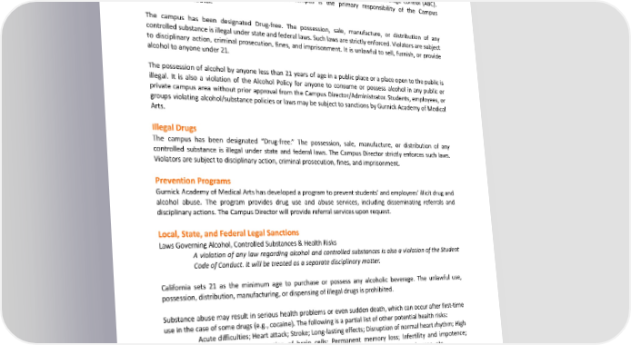 least once every two (2) years. Alcoholic Beverage Programs The possession, sale, or furnishing of alcohol on the Gurnick Academy of Medical Arts campus is governed by the Campus Director/Administrator and California state law. Laws regarding the possession, sale, consumption, or furnishing of alcohol are controlled by the California Department of Alcohol and Beverage Control (ABC). However, the enforcement of alcohol laws on campus is the primary responsibility of the Campus Director/Administrator. The campus has been designated Drug-free. The possession, sale, manufacture, or distribution of any controlled substance is illegal under state and federal laws. Such laws are strictly enforced. Violators are subject to disciplinary action, criminal prosecution, fines, and imprisonment. It is unlawful to sell, furnish, or provide alcohol to anyone under 21. The possession of alcohol by anyone less than 21 years of age in a public place or a place open to the public is illegal. It is also a violation of the Alcohol Policy for anyone to consume or possess alcohol in any public or private campus area without prior approval from the Campus Director/Administrator. Students, employees, or groups violating alcohol/substance policies or laws may be subject to sanctions by Gurnick Academy of Medical Arts. Illegal Drugs The campus has been designated “Drug-free.” The possession, sale, manufacture, or distribution of any controlled substance is illegal under state and federal laws. The Campus Director strictly enforces such laws. Violators are subject to disciplinary action, criminal prosecution, fines, and imprisonment. PreventionPrograms Gurnick AcademyofMedicalArtshasdevelopedaprogramtopreventstudents’andemployees’illicitdrugand alcohol abuse. The program provides drug use and abuse services, including disseminating referrals and disciplinary actions. The Campus Director will provide referral services upon request. Local, State, and Federal Legal Sanctions LawsGoverningAlcohol,ControlledSubstances&HealthRisks A violation of any law regarding alcohol and controlled substances is also a violation of the Student CodeofConduct.Itwillbetreatedasaseparatedisciplinarymatter. California sets 21 as the minimum age to purchase or possess any alcoholic beverage. The unlawful use, possession, distribution, manufacturing, or dispensing of illegal drugs is prohibited. Substance abuse may result in serious health problems or even sudden death, which can occur after first-time useinthecaseofsomedrugs(e.g.,cocaine).Thefollowingisapartiallistofotherpotentialhealthrisks: Acute difficulties; Heart attack; Stroke; Long-lasting effects; Disruption of normal heart rhythm; High blood pressure; Destruction of brain cells; Permanent memory loss; Infertility and impotence; Immunesystem;impairment;Kidneyfailure;Cirrhosisoftheliver;Pulmonarydamage,etc. Specific ordinances regarding violations of alcohol laws, including driving while intoxicated as well as for the unlawful possession or distribution of illegal drugs and alcohol, include the following: ● No person may sell, furnish, give, or cause to be sold, furnished, or given away any alcoholic beverage to a person under 21. No person under the age of 21 may purchase alcoholic beverages. (California Business and Professions Code 256560). 128