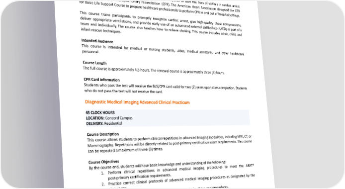Applicants must register online through our website. To complete registration, applicants must select the CPR Course on the CE Courses page. Choose an appropriate campus and desired start date and click the Registration button. Follow the required steps to complete registration. Students must contact their Admission Advisor to follow up on the completion of registration. CPRCourseDescription The CPR for Basic Life Support Course aims to train participants to save the lives of victims in cardiac arrest through high-quality cardiopulmonary resuscitation (CPR). The American Heart Association designed the CPR for Basic Life Support Course to prepare healthcare professionals to perform CPR in and out of hospital settings. This course trains participants to promptly recognize cardiac arrest, give high-quality chest compressions, deliver appropriate ventilations, and provide early use of an automated external defibrillator (AED) as part of a team and individually. The course also teaches how to relieve choking. This course includes adult, child, and infant rescue techniques. IntendedAudience This course is intended for medical or nursing students, aides, medical assistants, and other healthcare personnel. CourseLength Thefull course is approximately 4.5 hours. The renewal course is approximately three (3) hours. CPRCardInformation Students who pass the test will receive the BLS/CPR card valid for two (2) years upon class completion. Students whodonotpassthetestwillnotreceivethecard. Diagnostic Medical Imaging Advanced Clinical Practicum 45CLOCKHOURS LOCATION:ConcordCampus DELIVERY:Residential CourseDescription This course allows students to perform clinical repetitions in advanced imaging modalities, including MRI, CT, or Mammography. Repetitionswillbedirectlyrelatedtopost-primarycertification exam requirements. This course canberepeatedamaximumofthree(3)times. CourseObjectives Bythecourseend,studentswillhavebasicknowledgeandunderstandingofthefollowing: 1. Perform clinical repetitions in advanced medical imaging procedures to meet the ARRT® post-primary certification requirements. 2. Practice correct clinical protocols of advanced medical imaging procedures as designated by the clinical site. 3. Exemplify professionalism and follow all related clinical policies and procedures. 4. Provide adequate patient care and demonstrate proper teamwork to healthcare staff. 5. Demonstrateproperbodymechanicswhenprovidingpatientcare. Learning Outcomes 1. Operatewithintheparametersestablishedbytheclinicalevaluationtoolsandtheirobjectives. 2. Complete the minimum number of mandatory clinical repetitions as needed to be eligible to sit for thepost-primarycertification exam requirements. 235