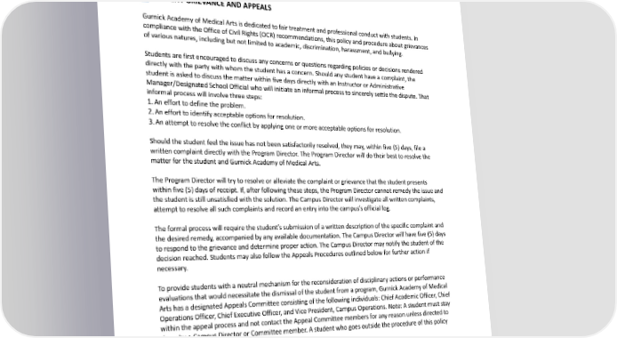 hour. Reading on Monitor: 180-200 wpm or 27 pages per hour. Slide presentations are closer to 100 wpmor15pagesperhour.” OSPH-related activities may be graded. Quarter Credit programs: Students must spend at least five (5) hours of OSPH per quarter credit (didactic or lab) to receive credit. Semester Credit program: Students must spend at least 7.5 hours of OSPH per semester credit (didactic or lab) to receive credit. STUDENTGRIEVANCEANDAPPEALS Gurnick AcademyofMedicalArtsisdedicatedtofairtreatmentandprofessionalconductwithstudents.In compliancewiththeOfficeofCivilRights(OCR)recommendations,thispolicyandprocedureaboutgrievances of various natures, including but not limited to academic, discrimination, harassment, and bullying. Students are first encouraged to discuss any concerns or questions regarding policies or decisions rendered directly with the party with whom the student has a concern. Should any student have a complaint, the student is asked to discuss the matter within five days directly with an Instructor or Administrative Manager/DesignatedSchoolOfficialwhowillinitiateaninformalprocesstosincerelysettlethedispute.That informal process will involve three steps: 1.Anefforttodefinetheproblem. 2.Anefforttoidentify acceptable options for resolution. 3.Anattempttoresolvetheconflictbyapplyingoneormoreacceptableoptionsforresolution. Shouldthestudentfeeltheissuehasnotbeensatisfactorilyresolved,theymay,withinfive(5)days,filea written complaint directly with the Program Director. The Program Director will do their best to resolve the matterforthestudentandGurnickAcademyofMedicalArts. TheProgramDirectorwilltrytoresolveoralleviatethecomplaintorgrievancethatthestudentpresents within five (5) days of receipt. If, after following these steps, the Program Director cannot remedy the issue and thestudentisstill unsatisfied with the solution. The Campus Director will investigate all written complaints, attempttoresolveallsuchcomplaintsandrecordanentryintothecampus’sofficiallog. Theformalprocesswillrequirethestudent’ssubmissionofawrittendescriptionofthespecificcomplaintand thedesiredremedy,accompaniedbyanyavailabledocumentation.TheCampusDirectorwillhavefive(5)days to respond to the grievance and determine proper action. The Campus Director may notify the student of the decision reached. Students may also follow the Appeals Procedures outlined below for further action if necessary. Toprovidestudentswithaneutralmechanismforthereconsiderationofdisciplinaryactionsorperformance evaluations that would necessitate the dismissal of the student from a program, Gurnick Academy of Medical Arts has a designated Appeals Committee consisting of the following individuals: Chief Academic Officer, Chief Operations Officer, Chief Executive Officer, and Vice President, Campus Operations. Note: A student must stay within the appeal process and not contact the Appeal Committee members for any reason unless directed to dosobyaCampusDirectororCommitteemember.Astudentwhogoesoutsidetheprocedureofthispolicy will be denied their appeal. ShouldtheCampusDirectorbeunabletoremedytheissueandthestudentisstillunsatisfiedwiththe outcome,thestudentmayasktheCampusDirector,inwriting,toforwardallwrittengrievancesand correspondencetotheAppealsCommittee.TheAppealsCommitteewillhavefive(5)workingdaystorespond to the appeal and determine proper action. 137