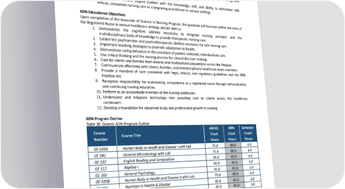 ● Help develop the Associate degree student to become a role model, patient advocate, patient educator, and caregiver who provides an environment conducive to maintaining dignity and maximizingthewellnessofeachindividual. ● Guide the Associate Degree student to actively participate in the learning process and assist with developing self-awareness and self-direction. ● Provide a shared learning environment between faculty and students by exchanging knowledge and experience to promote change within the participants. ● Prepare the Associate Degree student with the knowledge, skill, and ability to administer safe, ethical, competent nursing care as a beginning practitioner in various settings. ADNEducationalObjectives Upon completion of the Associate of Science in Nursing Program, the graduate will function within the roles of theRegisteredNurseinvarioushealthcaresettingsandbeableto: 1. Demonstrate the cognitive abilities necessary to integrate nursing concepts and the multidisciplinary body of knowledge to provide therapeutic nursing care. 2. Exhibit the psychomotor and psychotherapeutic abilities necessary for safe nursing care. 3. Implementteachingstrategiestopromoteadaptationtohealth. 4. Demonstratecaringbehaviorsintheprovisionofpatient-centered,individualized care. 5. Usecritical thinking and the nursing process for clinical decision-making. 6. Careforclients and families from diverse and multicultural populations across the lifespan. 7. Communicateeffectivelywithclients, families, and interdisciplinary healthcare team members. 8. Provide a standard of care consistent with legal, ethical, and regulatory guidelines and the BRN Practice Act. 9. Recognize responsibility for maintaining competence as a registered nurse through self-evaluation andcontinuingnursingeducation. 10. Perform as an accountable member of the nursing profession. 11. Understand and integrate technology into providing care to clients across the healthcare continuum. 12. Develop a foundation for advanced study and professional growth in nursing. ADNProgramOutline Table 38. Generic ADN Program Outline ABHES BRN Semester Course CourseTitle Clock Clock Credit Number Hours Hours Hours GE020A HumanBodyinHealthandDiseaseIwithLab 75.0 90.0 4.0 GE041 GeneralMicrobiologywithLab 75.0 90.0 4.0 GE222 English Reading and Composition 45.0 45.0 3.0 GE112 AlgebraI 45.0 45.0 3.0 GE202 GeneralPsychology 45.0 45.0 3.0 GE020B HumanBodyinHealthandDiseaseIIwithLab 75.0 90.0 4.0 GE031 Nutrition in Health & Disease 45.0 45.0 3.0 GE110 Critical Thinking 45.0 45.0 3.0 GE201 Introduction to Sociology 45.0 45.0 3.0 GE240 Public Speaking, Basics of Effective Communication 45.0 45.0 3.0 RN100 FundamentalsofNursingTheory* 45.0 45.0 3.0 RN101 FundamentalsofNursingClinicalandLab* 157.5 157.5 3.5 RN102 Health AssessmentTheory* 30.0 30.0 2.0 RN103 Health AssessmentSkills Lab* 67.5 67.5 1.5 193