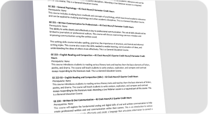 Prerequisite: None This course studies basic methods and concepts of sociology, which have broad academic relevance and can be applied to studying sociology and other academic disciplines. This is a General Education Course. GE201-50–IntroductiontoSociology(50hr)–50ClockHours/5QuarterCreditHours Prerequisite: None This course studies basic methods and concepts of sociology, which have broad academic relevance and can be applied to studying sociology and other academic disciplines. Attending a Live Webinar session is a required part of this course. This is a General Education Course. GE202–GeneralPsychology–45ClockHours/3SemesterCreditHours Prerequisite: None This course includes studying basic methods and concepts of psychology, which have broad academic relevance andcanbeappliedtostudyingpsychologyandotheracademicdisciplines.ThisisaGeneralEducationCourse. GE221–WrittenCommunicationforProfessionals–45ClockHours/3SemesterCreditHours Prerequisite: None Theability to write clearly and effectively is key to professional communication. This set of skills should not be limited to journalists or professional authors. This course will discuss overcoming common mistakes and improvingcommunicationusingthewrittenword. This writing skills course includes spelling, grammar, the importance of structure, and formal and informal writing styles. This course also covers the skills needed to enable learning, communication of ideas, and understandingtheideasofothersmoreeffectively.ThisisaGeneralEducationCourse. GE222–EnglishReadingandComposition–45ClockHours/4.5QuarterCreditHours/3SemesterCredit Hours Prerequisite: None This course introduces students to reading various literary texts and teaches them the basic elements of fiction, poetry, and drama. The course will teach students to write analysis, explication, and compare-and-contrast essays responding to the literature read. This is a General Education Course. GE222-50–EnglishReadingandComposition(50hr)–50ClockHours/5QuarterCreditHours Prerequisite: None This course introduces students to reading various literary texts and teaches them the basic elements of fiction, poetry, and drama. The course will teach students to write analysis, explication, and compare-and-contrast essays responding to the literature read. Attending a Live Webinar session is a required part of this course. This is a General Education Course. GE230–Written&OralCommunication–45ClockHours/4.5QuarterCreditHours Prerequisites: None This course will explore the fundamental analog and digital skills of oral and written communication to help create professional written and oral communication within their careers. This is an introduction to various methods used to communicate effectively and create a language that articulates information to connect a speakertoanaudience.ThisisaGeneralEducationCourse. GE240–PublicSpeaking,BasicsofEffectiveCommunication–45ClockHours/3SemesterCreditHours Prerequisite: None This course introduces communication in interpersonal relationships, group interactions, and formal speaking, with skill development in listening, speech preparation, and oral presentation. This is a General Education Course. 251