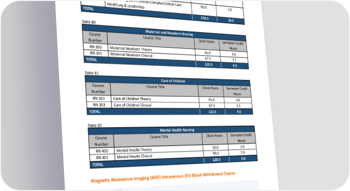 Course CourseTitle Clock Hours SemesterCredit Number Hours RN304 Medical/Surgical III Theory-Advanced Med/Surg 45.0 3.0 RN305 Medical/Surgical III Clinical-Advanced Med/Surg 90.0 2.0 RN402 Medical/Surgical IV Theory-Complex/Critical Care 45.0 3.0 Med/Surg&Leadership RN403 Medical/Surgical IV Clinical-Complex/Critical Care 90.0 2.0 Med/Surg&Leadership TOTAL 270.0 10.0 Table 80. MaternalandNewbornNursing Course CourseTitle Clock Hours SemesterCredit Number Hours RN300 MaternalNewbornTheory 45.0 3.0 RN301 MaternalNewbornClinical 67.5 1.5 TOTAL 112.5 4.5 Table 81. CareofChildren Course CourseTitle Clock Hours SemesterCredit Number Hours RN302 CareofChildrenTheory 45.0 3.0 RN303 CareofChildrenClinical 67.5 1.5 TOTAL 112.5 4.5 Table 82. MentalHealthNursing Course CourseTitle Clock Hours SemesterCredit Number Hours RN400 MentalHealthTheory 30.0 2.0 RN401 MentalHealthClinical 90.0 2.0 TOTAL 120.0 4.0 MagneticResonanceImaging(MRI)Intravenous(IV)BloodWithdrawalCourse 12CLOCKHOURS 2-DAYCOURSE|6HOURSPERDAY LOCATION:SanJose DELIVERY:Residential Registration Before registration, applicants must meet the following admission criteria: 1. Provide a valid Photo Identification 245