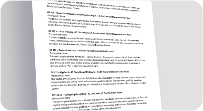 GE031–NutritioninHealthandDisease–45ClockHours/3SemesterCreditHours Prerequisite: None This course covers the nutrient needs for maintaining a positive nutritional status, including diets to fit specific health needs and primary nutritional care. GE041–GeneralMicrobiologyw/Lab–75ClockHours)/90BRNClockHours/6QuarterCreditHours/4 SemesterCreditHours Prerequisite: None This course presents basic concepts of microbiology and practical applications to medicine, public health, and theenvironment,withlaboratorytechniquesinisolation,enumeration,andidentificationofmicroorganisms. This is a General Education Course. GE103–GrowthandDevelopmentthroughLifespan–45ClockHours/3SemesterCreditHours Prerequisite: None This course discusses the existing growth and development theories. It focuses on understanding the dynamic sequenceofbiological, psychological, and sociological changes that occur through the life cycle from birth to death. This is a General Education Course. GE110–CriticalThinking–45ClockHours/4.5QuarterCreditHours/3SemesterCreditHours Prerequisites: None This course teaches students the skills they need to think for themselves—skills they will call upon in this course, other college courses, and the world that awaits. This course covers the core concepts with real-world examplesandpracticeexercises.ThisisaGeneralEducationCourse. GE111–ResearchStatistics–45ClockHours/3SemesterCreditHours Prerequisite: None This course is preparation for RN 305 – Nursing Research. The course introduces statistical test tools, the conditions under which these tools are used, statistical calculation, and the meaning of statistics. The tools are also discussed as the basis of data analysis, probability, and statistical inference and their importance in decision-making. This is a General Education Course. GE112–AlgebraI–45ClockHours/4.5QuarterCreditHours/3SemesterCreditHours Prerequisites: None This course gives students the math skills that provide a foundation for more advanced courses. Students will explore writing and solving linear and nonlinear equations, powers and exponents, quadratic equations, polynomials and factoring, graphing, and solving linear inequalities and functions. This is a General Education Course. GE112-50–CollegeAlgebra(50hr)–50ClockHours/5QuarterCreditHours Prerequisite: None This course gives students the math skills that provide a foundation for more advanced courses. Students will explore writing and solving linear and nonlinear equations, powers and exponents, quadratic equations, polynomials and factoring, graphing and solving linear inequalities, and functions. Attending a Live Webinar session is a required part of this course. This is a General Education Course. GE120–IntroductiontoInformationSystems–45ClockHours/3SemesterCreditHours Prerequisite: None This course introduces personal computer application software, hardware components, and the Internet. The course covers an introduction to word processing, electronic spreadsheets, databases, and presentation software. This is a General Education Course. GE201–IntroductiontoSociology–45ClockHours/4.5QuarterCreditHours/3SemesterCreditHours 250