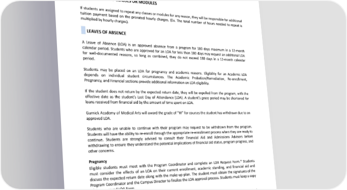 the termination of “Student” status for an indefinite period. Please see our Re-enrollment Policy for more details. Disciplinary probation status does not prohibit a student from being placed on academic probation and remediation. Please see the summary of the Disciplinary Probation guidelines per program in the Academic Probation/Remediationpolicy. REPETITIONOFCLASSESORMODULES If students are assigned to repeat any classes or modules for any reason, they will be responsible for additional tuition payment based on the prorated hourly charges. (Ex. The total number of hours needed to repeat is multiplied by hourly charges). LEAVESOFABSENCE A Leave of Absence (LOA) is an approved absence from a program for 180 days maximum in a 12-month calendar period. Students who are approved for an LOA for less than 180 days may request an additional LOA for well-documented reasons, so long as combined, they do not exceed 180 days in a 12-month calendar period. Students may be placed on an LOA for pregnancy and academic reasons. Eligibility for an Academic LOA depends on individual student circumstances. The Academic Probation/Remediation, Re-enrollment, Pregnancy, and Financial sections provide additional information on LOA eligibility. If the student does not return by the expected return date, they will be expelled from the program, with the effective date as the student’s Last Day of Attendance (LDA). A student’s grace period may be shortened for loans received from financial aid by the amount of time spent on LOA. Gurnick Academy of MedicalArtswill award the grade of “W” for courses the student has withdrawn due to an approvedLOA. Students who are unable to continue with their program may request to be withdrawn from the program. Students will have the ability to re-enroll through the appropriate re-enrollment process when they are ready to continue. Students are strongly advised to consult their Financial Aid and Admissions Advisors before withdrawing to ensure they understand the potential implications of financial aid status, program progress, and other concerns. Pregnancy Eligible students must meet with the Program Coordinator and complete an LOA Request Form.* Students must consider the effects of an LOA on their current enrollment, academic standing, and financial aid and discuss the expected return date along with the make-up plan. The student must obtain the signatures of the Program Coordinator and the CampusDirectortofinalize the LOA approval process. Students must keep a copy of the approved LOA Form. The Program Coordinator, Campus Director, or School Official Designee will consider the individual circumstances of the student and the frequency of LOA requests during the approval process. Should the issuance of an LOA be such that it would significantly interfere with the planned completion of a program of study, appropriate actions will occur at the sole discretion of the Program Coordinator/Campus Director or designated official. *Refer to the Pregnancy Policy for more details. LOA Request Forms are available on the Gurnick Academy of 161