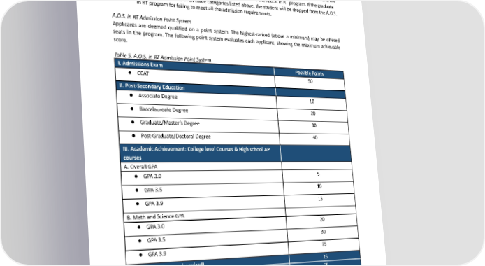 c. Preparation to become successful in this program. d. Sources used to prepare for the essay. 6. PassanadmissioninterviewwiththeProgramDirectoranddesignees. 7. Applicants whopossessacurrentStateofCaliforniaLimitedPermit(License)inChest,Extremities, andTorsoSkeletalwill receive credit granting for a portion of the program. 8. GurnickAcademyofMedicalArtsXTMASprogramgraduateswhohavetakenthestateexamandare awaiting the results can enroll as provisional students into the A.O.S. in RT program. If the graduate fails to earn a license in all three categories listed above, the student will be dropped from the A.O.S. in RT program for failing to meet all the admission requirements. A.O.S. in RT Admission Point System Applicants are deemed qualified on a point system. The highest-ranked (above a minimum) may be offered seats in the program. The following point system evaluates each applicant, showing the maximum achievable score. Table 5. A.O.S. in RT Admission Point System I. Admissions Exam Possible Points 50 ● CCAT II. Post-Secondary Education 10 ● AssociateDegree 20 ● BaccalaureateDegree 30 ● Graduate/Master’sDegree 40 ● Post-Graduate/DoctoralDegree III. Academic Achievement: College level Courses & High school AP courses A. Overall GPA 5 ● GPA3.0 10 ● GPA3.5 15 ● GPA3.9 B. MathandScienceGPA 20 ● GPA3.0 30 ● GPA3.5 35 ● GPA3.9 IV. One-Page Resume(required) 25 V. Essay – One-page, APA Format 25 Theessaywillinclude: - Statementofwhyyouwouldliketojointhismodality. - Theessential functions and role of a technologist in this field. - Preparation to become successful in this program. - Sources used to prepare for the essay. 31