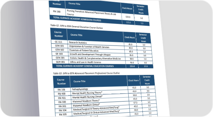 RN202 Medical/Surgical II Theory-Intermediate Med/Surg* 45.0 3.0 RN203 Medical/Surgical II Clinical-Intermediate Med/Surg* 90.0 2.0 TOTALNURSINGPREREQUISITECOURSES 630.0 24.0 *Paired course. See the course description for more details. Table 61. LVN to BSN Advanced Placement Admission Course Outline Semester Course CourseTitle Clock Hours Credit Number Hours Nursing Transition Advanced Placement Theory & Lab RN180 120.0 5.0 Course TOTALGURNICKACADEMYADMISSIONCOURSES 120.0 5.0 Table 62. LVN to BSN General Education Course Outline Semester Course CourseTitle Clock Hours Credit Number Hours GE111 ResearchStatistics 45.0 3.0 GEH101 Organization & Function of Health Services 45.0 3.0 GEH102 Essentials of Patient Education 45.0 3.0 GE103 GrowthandDevelopmentThroughLifespan 45.0 3.0 GEH201 Holistic Health & Complementary Alternative Medicine 30.0 2.0 GEH301 Ethics and Law in Health Science 45.0 3.0 TOTALGURNICKACADEMYGENERALEDUCATIONCOURSES 255.0 17.0 Table 63. LVN to BSN Advanced Placement Professional Course Outline Semester Course CourseTitle Clock Hours Credit Number Hours RN106 Pathophysiology 45.0 3.0 RN400 MentalHealthNursingTheory* 45.0 3.0 RN401 MentalHealthNursingClinical* 90.0 2.0 RN300 MaternalNewbornTheory* 45.0 3.0 RN301 MaternalNewbornClinical* 67.5 1.5 RN304 Medical/Surgical III Theory-Advanced Med/Surg* 45.0 3.0 RN305 Medical/Surgical III Clinical-Advanced Med/Surg* 90.0 2.0 RN302 CareofChildrenTheory* 45.0 3.0 RN303 CareofChildrenClinical* 67.5 1.5 RN402 Medical/Surgical IV Theory-Complex/Critical Care 45.0 3.0 Med/Surg&Leadership* RN403 Medical/Surgical IV Clinical-Complex/Critical Care 90.0 2.0 Med/Surg&Leadership* RN404 CommunityHealthNursingTheory* 45.0 3.0 213