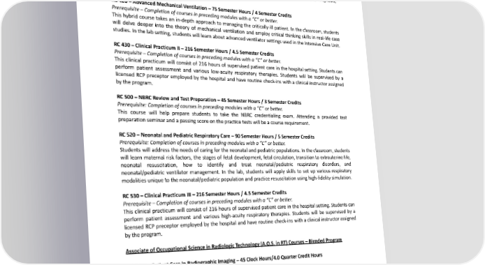 RC400–RespiratoryCareFundamentalsIV–60SemesterHours/4SemesterCredits Prerequisite – Completion of courses in preceding modules with a “C” or better. This course will explore cardiopulmonary diseases, such as pulmonary infections, chronic obstructive pulmonary disease, interstitial lung disease, pleural disease, acute respiratory distress syndrome, heart failure, lung cancer, neuromuscular disease, sleep disorders, etc. Students will examine symptoms, diagnosis, treatment, and patient management. RC420–AdvancedMechanicalVentilation–75SemesterHours/4SemesterCredits Prerequisite – Completion of courses in preceding modules with a “C” or better. This hybrid course takes an in-depth approach to managing the critically ill patient. In the classroom, students will delve deeper into the theory of mechanical ventilation and employ critical thinking skills in real-life case studies. In the lab setting, students will learn about advanced ventilator settings used in the Intensive Care Unit. RC430–ClinicalPracticumII–216SemesterHours/4.5SemesterCredits Prerequisite – Completion of courses in preceding modules with a “C” or better. This clinical practicum will consist of 216 hours of supervised patient care in the hospital setting. Students can perform patient assessment and various low-acuity respiratory therapies. Students will be supervised by a licensed RCP preceptor employed by the hospital and have routine check-ins with a clinical instructor assigned bytheprogram. RC500–NBRCReviewandTestPreparation–45SemesterHours/3SemesterCredits Prerequisite: Completion of courses in preceding modules with a “C” or better. This course will help prepare students to take the NBRC credentialing exam. Attending a provided test preparation seminar and a passing score on the practice tests will be a course requirement. RC520–NeonatalandPediatricRespiratoryCare–90SemesterHours/5SemesterCredits Prerequisite: Completion of courses in preceding modules with a “C” or better. Students will address the needs of caring for the neonatal and pediatric populations. In the classroom, students will learn maternal risk factors, the stages of fetal development, fetal circulation, transition to extrauterine life, neonatal resuscitation, how to identify and treat neonatal/pediatric respiratory disorders, and neonatal/pediatric ventilator management. In the lab, students will apply skills to set up various respiratory modalities unique to the neonatal/pediatric population and practice resuscitation using high-fidelity simulation. RC530–ClinicalPracticumIII–216SemesterHours/4.5SemesterCredits Prerequisite – Completion of courses in preceding modules with a “C” or better. This clinical practicum will consist of 216 hours of supervised patient care in the hospital setting. Students can perform patient assessment and various high-acuity respiratory therapies. Students will be supervised by a licensed RCP preceptor employed by the hospital and have routine check-ins with a clinical instructor assigned bytheprogram. Associate of Occupational Science in Radiologic Technology (A.O.S. in RT) Courses – Blended Program XRT101–PatientCareinRadiographicImaging–45ClockHours/4.0QuarterCreditHours Prerequisite: None This course introduces students to basic imaging principles and patient care. Students review medical ethics, pediatrics, and geriatrics patient care. The duties and responsibilities of working in Radiology are also presented, emphasizing communication and relationships. A review of infection control, standard precautions, andtransmission-basedprecautionscovered. The theory, basic venipuncture techniques, and the administration of diagnostic contrast agents include intravenous medications. Routine and emergency patient care procedures and the radiographer’s role in patient 258