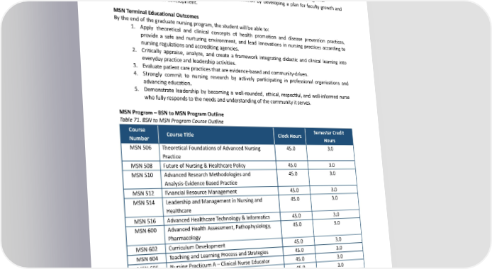 of the stakeholders and community it serves. 5. Ongoing visits to its curriculum and revising as needed, ensuring that its nursing graduates can adapt to rapid healthcare delivery and practice changes. 6. Develop a learning platform inspiring its nursing graduates to continuously pursue recognition and excellence in practice, research, and community outreach. 7. Encouragenurturingpartnershipswithitscommunityorganizationsforacademicprograms. 8. Motivate nursing graduates to seek higher education by developing a plan for faculty growth and professional development. MSNTerminalEducationalOutcomes Bytheendofthegraduatenursingprogram,thestudentwillbeableto: 1. Apply theoretical and clinical concepts of health promotion and disease prevention practices, provide a safe and nurturing environment, and lead innovations in nursing practices according to nursing regulations and accrediting agencies. 2. Critically appraise, analyze, and create a framework integrating didactic and clinical learning into everydaypractice and leadership activities. 3. Evaluate patient care practices that are evidence-based and community-driven. 4. Strongly commit to nursing research by actively participating in professional organizations and advancingeducation. 5. Demonstrate leadership by becoming a well-rounded, ethical, respectful, and well-informed nurse whofullyrespondstotheneedsandunderstandingofthecommunityitserves. MSNProgram–BSNtoMSNProgramOutline Table 71. BSN to MSN Program Course Outline Course SemesterCredit CourseTitle Clock Hours Number Hours MSN506 Theoretical Foundations of Advanced Nursing 45.0 3.0 Practice MSN508 Future of Nursing & Healthcare Policy 45.0 3.0 MSN510 AdvancedResearchMethodologiesand 45.0 3.0 Analysis-Evidence Based Practice MSN512 Financial Resource Management 45.0 3.0 MSN514 Leadership and ManagementinNursingand 45.0 3.0 Healthcare MSN516 AdvancedHealthcareTechnology&Informatics 45.0 3.0 MSN600 AdvancedHealthAssessment,Pathophysiology, 45.0 3.0 Pharmacology MSN602 Curriculum Development 45.0 3.0 MSN604 Teaching and Learning Process and Strategies 45.0 3.0 MSN605 Nursing Practicum A – Clinical Nurse Educator 45.0 3.0 MSN606 AssessmentandEvaluationofLearning 45.0 3.0 MSN607 Nursing Practicum B – Academic Nurse Educator 45.0 3.0 TOTAL 540.0 36.0 MSNProgramInformation,Length,andSchedule The Master of Science in Nursing program (BSN to MSN) admission track is a six (6) semester distance education program for RNs to complete their Master of Science Degree in Nursing in two (2) years. Each 226