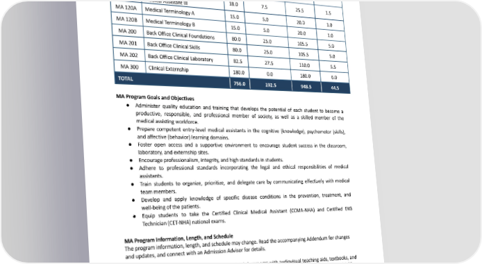 Front Office The Medical MA102 82.5 27.5 110.0 5.5 Professional AnatomyandPhysiologyfor MA107 19.0 7.5 26.5 1.5 MedicalAssistant I AnatomyandPhysiologyfor MA108 19.0 7.5 26.5 1.5 MedicalAssistant II AnatomyandPhysiologyfor MA109 18.0 7.5 25.5 1.5 MedicalAssistant III MA120A MedicalTerminologyA 15.0 5.0 20.0 1.0 MA120B MedicalTerminologyB 15.0 5.0 20.0 1.0 MA200 BackOfficeClinical Foundations 80.0 25.0 105.5 5.0 MA201 BackOfficeClinical Skills 80.0 25.0 105.5 5.0 MA202 BackOfficeClinical Laboratory 82.5 27.5 110.0 5.5 MA300 Clinical Externship 180.0 0.0 180.0 6.0 TOTAL 756.0 192.5 948.5 44.5 MAProgramGoalsandObjectives ● Administer quality education and training that develops the potential of each student to become a productive, responsible, and professional member of society, as well as a skilled member of the medicalassisting workforce. ● Prepare competent entry-level medical assistants in the cognitive (knowledge), psychomotor (skills), andaffective (behavior) learning domains. ● Foster open access and a supportive environment to encourage student success in the classroom, laboratory, and externship sites. ● Encourageprofessionalism,integrity, and high standards in students. ● Adhere to professional standards incorporating the legal and ethical responsibilities of medical assistants. ● Train students to organize, prioritize, and delegate care by communicating effectively with medical teammembers. ● Develop and apply knowledge of specific disease conditions in the prevention, treatment, and well-being of the patients. ● Equip students to take the Certified Clinical Medical Assistant (CCMA-NHA) and Certified EKG Technician (CET-NHA) national exams. MAProgramInformation,Length,andSchedule Theprograminformation,length,andschedulemaychange.ReadtheaccompanyingAddendumforchanges andupdates,andconnectwithanAdmissionAdvisorfordetails. TheMedicalAssistantprogramprovidesalibraryandclassroomswithaudiovisualteachingaids,textbooks,and simulators. The Instructor-to-Student ratio is 1:15 in the laboratory, 1:30 during residential lectures, and 1:25 during online lectures. The program consists of 13 courses contained in three (3) modules. Students must be available four (4) hours daily, Monday through Friday, for didactic and laboratory coursework. 228
