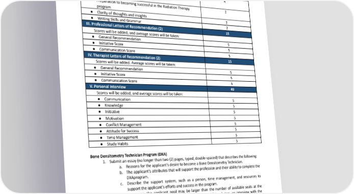 Criteria Possible Points I. Admissions Exam 50 ● CCAT(minimumscore25points) 50 II. Application Essay to Radiation Therapy Program – APA Format 10 Essay will include: ● StatementofPurposeforenrollingintheRadiation 4 Therapyprogram 2 ● PreparationtobecomingsuccessfulintheRadiationTherapy program 2 ● Clarityofthoughtsandinsights 2 ● WritingSkillsandGrammar III. Professional Letters of Recommendation (2) 15 Scores will be added, and average scores will be taken: ● GeneralRecommendation 5 ● Initiative Score 5 ● CommunicationScore 5 IV. Therapist Letters of Recommendation (2) 15 Scores will be added. Average scores will be taken: ● GeneralRecommendation 5 ● Initiative Score 5 ● CommunicationScore 5 V. Personal Interview 40 Scores will be added, and average scores will be taken: ● Communication 5 ● Knowledge 5 ● Initiative 5 ● Motivation 5 5 ● ConflictManagement 5 ● AttitudeforSuccess 5 ● TimeManagement 5 ● StudyHabits BoneDensitometryTechnicianProgram(DXA) 1. Submitanessay(nolongerthantwo(2)pages,typed,double-spaced)thatdescribesthefollowing: a. Reasonsfortheapplicant’sdesiretobecomeaBoneDensitometryTechnician. b. The applicant’s attributes that will support the profession and their ability to complete the DXAprogram. c. Describe the support system, such as a person, time management, and resources to supporttheapplicant’s efforts and success in the program. 2. In some campuses, the applicant pool may be larger than the number of available seats at the desired campus. In this case, the campus may require an additional step, an interview with the ProgramDirector, Assistant Program Director, or designees. BoneDensitometryTechnician(DXA)AdmissionPointSystem Applicants are deemed qualified on a point system. The highest-ranked (above a minimum) will be offered seats in the program. The following point system evaluates each applicant, showing the maximum score achievable. 51