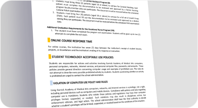2. Students must have a bachelor’s degree before taking the American Registry of Radiologic Technology Radiation Therapy certification exam. 3. Students must complete all clinical hours as required by CDPH-RHB. Additional Graduation Requirements for the Master of Science in Nursing Program (BSN to MSN) 1. The student must have a minimum GPA of 3.0 to graduate. Additional Graduation Requirements for the Dental Assistant Program DA 1. Students must bring three (3) patients (aged 18 or above) to campus for Coronal Polishing. Each patient must complete the documentation to be reviewed and approved by a Dental Assisting program faculty memberwhocanparticipate.Thedocumentmustbereceivedbeforethescheduled Coronal Polish examination date. 2. Students must bring four (4) patients (aged 18 or above) to campus for a full set of mouth X-rays (FMX). Each patient must fill out the documentation to be reviewed and approved by a dentist, stating they can participate. The document must be received before the scheduled FMX examination date. Additional Graduation Requirements for the Vocational Nurse Program (VN) 1. The student must have completed the program exit examination. Students will be given up to two (2) attemptstocompletetheexitexam. ONLINECOURSERESPONSETIME For online courses, the institution has seven (7) days between the institution’s receipt of student lessons, projects, or dissertations and the institution’s mailing of its response or evaluation. STUDENTTECHNOLOGYACCEPTABLEUSEPOLICIES Students are responsible for actions and activities involving Gurnick Academy of Medical Arts computers, personal computers, networks, Internet services, and personal computer files, passwords, and accounts. These policies provide general direction concerning computer usage and examples of prohibited uses. The rules do notattempttodescribeeverypossibleprohibitedactivitybystudents.Studentsquestioningwhetheranactivity is prohibited are urged to contact the school administration. VIOLATIONOFCOMPUTERUSEPOLICYANDRULES Using Gurnick Academy of Medical Arts computers, networks, and Internet services is a privilege, not a right, including personal devices such as computers and mobile devices. Compliance with policies and rules regarding computer use is mandatory. Students who violate these policies and regulations may have their computer privileges limited, suspended, or revoked. Such violations may also result in disciplinary action, law enforcement referrals, and legal action. The school administration shall have the final authority to decide whetherastudent’sprivileges will be limited, suspended, or revoked based on the conditions of the situation. REQUIREDAPPLICATIONS All Gurnick Academy of Medical Arts students must have the following application installed on their computers: ● Chromebrowser ● AdobeAcrobatReader ● VitalSourcebookshelf 163