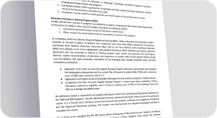 andprograms. 5. Competency-based credit is granted for knowledge and skills acquired through experience. Written andpractical examinations will determine credit. 6. Exceptions may be madeforcredits granted over five (5) years for General Education courses. Associate of Science in Magnetic Resonance Imaging Program (A.S. in MRI) Credits earned from courses or programs approved by: 1. Joint Review Committee on Education in Radiologic Technology accredited magnetic resonance imagingtechnologycoursesandprograms. 2. Competency-based credit is granted for knowledge and skills acquired through experience. Written andpractical examinations will determine credit. 3. Exceptions may be madeforcredits granted over five (5) years of General Education courses. Associate of Science in Nursing Program (ADN) Credits earned from courses or programs accredited by an agency recognized by the United States Department of Education (U.S.DOE) or the Council for Higher Education Accreditation (CHEA): 1. Licensed Vocational Nursing Courses (22 Semester Credit Hours) 2. Othercoursestheschooldeterminesareequivalenttocoursesintheprogram. In compliance with the California Board of Registered Nursing (BRN), military education and experience credit is available at Gurnick Academy of Medical Arts. Individuals who have held Military Healthcare Occupations, specifically Basic Medical Technician Corpsman (Navy HM or Air Force BMTCP), Army Healthcare Specialist (68W Army Medic), or Air Force Independent Duty Medical Technician (IMDT 4NOX1C) may achieve advanced placement into the Associate of Science in Nursing program upon review and approval from the Program Director. Submit documentation of education and experience to qualify them for the specific Military Health Care Occupation, and upon successful completion of the challenge exam, dosage calculation exam, and skills competencyevaluation. ● Applicants must meet all Associate Degree Nursing Program admission requirements and complete the designated prerequisites and the current Test of Essential Academic Skills (TEAS) with a minimum score of 64% and a minimumGPAof2.5. ● Applicantsmustsubmitproofofhonorabledischargefromthemilitaryandproofofmilitaryservice. ● Acceptance into the Associate Degree Nursing Program is based upon space availability, military education, experience eligibility, and a minimum passing score of 90% on the Challenge Exam and 86%onadosagecalculationexam. An admission course is required for all students electing to enroll in the LVN Advanced Placement Pathways for the ADN andBSNprograms.TheRN180NursingTransitionAdvancedPlacementTheory&Labistheadmission course. It is a five (5) unit, 120-hour course that evaluates the student’s readiness to be eligible for enrollment into the Advanced Placement pathway. The student must demonstrate the required knowledge and skills to completethiscourse. All students must complete the RN 180 course before starting any Professional Courses. Students enrolled in the RN 180 are eligible to challenge the OB and Pediatrics courses. Students must contact the Assistant Director to request the challenge exams. The OB and Pediatrics theory courses are paired with a corresponding clinical course. Failure in one course equals failure in the paired course. Students must pass the challenge exams before scheduling the competency exams. The minimum passing score for the challenge exam is 90%, and the minimum passing score for the competency exam is 90%. If the above requirementsareunmet,thestudentwillcompletetherequiredcoursesasscheduled. 77