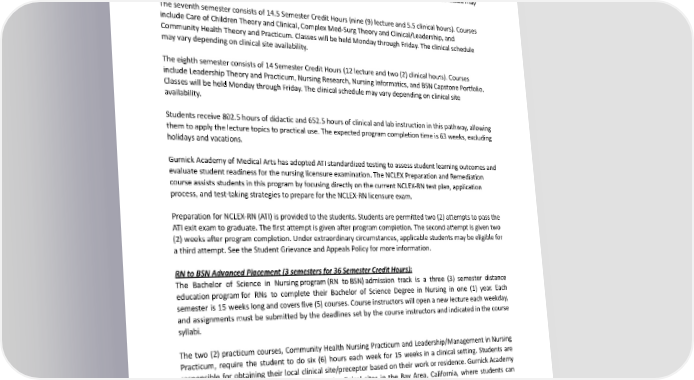Thethirdsemesteris17SemesterCreditHoursofGeneralEducationCoursesviaonlinedelivery.Thefourthand fifth semesters with 24 semester credit hours are credits granted from LVN Education. Thesixthsemesterconsistsof17.5SemesterCreditHours(12lectureand5.5clinicalhours).Coursesinclude Pathophysiology, Mental Health Theory and Clinical, Maternal/Newborn Theory and Clinical, and Advanced Med/SurgITheoryandClinical.TheoryandLabwillbeheldMondaythroughFriday.Theclinicalschedulemay vary depending on clinical site availability. Theseventhsemesterconsistsof14.5SemesterCreditHours(nine(9)lectureand5.5clinicalhours).Courses include Care of Children Theory and Clinical, Complex Med-Surg Theory and Clinical/Leadership, and CommunityHealthTheoryandPracticum.ClasseswillbeheldMondaythroughFriday.Theclinicalschedule mayvarydependingonclinicalsiteavailability. Theeighthsemesterconsistsof14SemesterCreditHours(12lectureandtwo(2)clinicalhours).Courses include Leadership Theory and Practicum, Nursing Research, Nursing Informatics, and BSN Capstone Portfolio. Classes will be held Monday through Friday. The clinical schedule may vary depending on clinical site availability. Students receive 802.5 hours of didactic and 652.5 hours of clinical and lab instruction in this pathway, allowing themtoapplythelecturetopicstopracticaluse.Theexpectedprogramcompletiontimeis63weeks,excluding holidays and vacations. Gurnick AcademyofMedicalArtshasadoptedATIstandardizedtestingtoassessstudentlearningoutcomesand evaluate student readiness for the nursing licensure examination. The NCLEX Preparation and Remediation course assists students in this program by focusing directly on the current NCLEX-RN test plan, application process, and test-taking strategies to prepare for the NCLEX-RN licensure exam. Preparation for NCLEX-RN (ATI) is provided to the students. Students are permitted two (2) attempts to pass the ATI exit exam to graduate. The first attempt is given after program completion. The second attempt is given two (2) weeks after program completion. Under extraordinary circumstances, applicable students may be eligible for athird attempt. See the Student Grievance and Appeals Policy for more information. RNtoBSNAdvancedPlacement(3semestersfor36SemesterCreditHours): The Bachelor of Science in Nursing program (RN to BSN) admission track is a three (3) semester distance education program for RNs to complete their Bachelor of Science Degree in Nursing in one (1) year. Each semester is 15 weeks long and covers five (5) courses. Course instructors will open a new lecture each weekday, and assignments must be submitted by the deadlines set by the course instructors and indicated in the course syllabi. The two (2) practicum courses, Community Health Nursing Practicum and Leadership/Management in Nursing Practicum, require the student to do six (6) hours each week for 15 weeks in a clinical setting. Students are responsible for obtaining their local clinical site/preceptor based on their work or residence. Gurnick Academy of Medical Arts has agreements with multiple clinical sites in the Bay Area, California, where students can alternatively complete their clinical/preceptorship. The expected program completion time is 45 weeks, excluding holidays and vacation times. The Instructor-to-Student ratio is 1:25 during lectures and 1:1 during clinical externships. 217