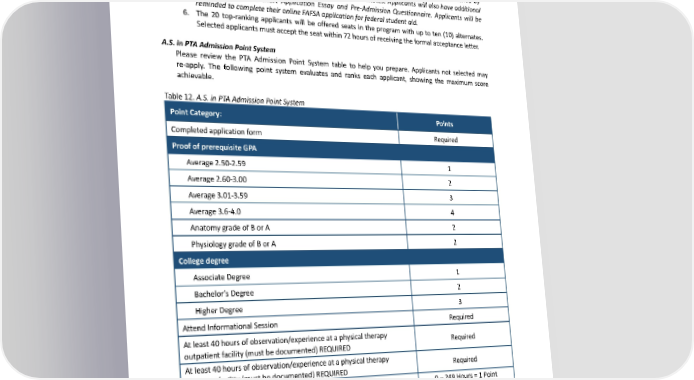 4. Applicants must submit all required documents by the application deadline. Only complete applications will be considered. Please plan for time to submit official transcripts and complete observation hours. 5. The PTA Admissions Committee will review all applications and approve the 40 top-scoring applicants for an on-campus interview and essay writing. Please see the scoring rubric. The interview criteria are based upon ’Generic Abilities’ identified through a study published by UW-Madison. Interviews will be scheduled for 15 – 20 minutes. Applicants will also have additional time to complete a short Application Essay and Pre-Admission Questionnaire. Applicants will be remindedtocompletetheironlineFAFSAapplicationforfederalstudentaid. 6. The 20 top-ranking applicants will be offered seats in the program with up to ten (10) alternates. Selected applicants must accept the seat within 72 hours of receiving the formal acceptance letter. A.S. in PTA Admission Point System Please review the PTA Admission Point System table to help you prepare. Applicants not selected may re-apply. The following point system evaluates and ranks each applicant, showing the maximum score achievable. Table 12. A.S. in PTA Admission Point System Point Category: Points Completedapplicationform Required ProofofprerequisiteGPA Average2.50-2.59 1 Average2.60-3.00 2 Average3.01-3.59 3 Average3.6-4.0 4 AnatomygradeofBorA 2 Physiology grade of B or A 2 College degree Associate Degree 1 Bachelor’s Degree 2 Higher Degree 3 AttendInformational Session Required At least 40 hours of observation/experience at a physical therapy Required outpatient facility (must be documented) REQUIRED At least 40 hours of observation/experience at a physical therapy Required inpatient facility (must be documented) REQUIRED 0–249Hours=1Point 250–499Hours=2Point Paid experience in a Physical Therapy Facility 500–749Hours=3Points 750–999=4Points 1000+Hours=5Points Basic AnatomyAssessmentTest 42