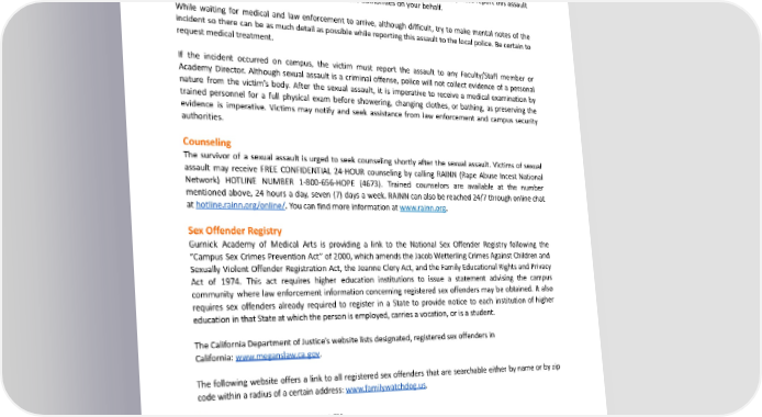 The school will inform the complainant that its ability to respond may be limited should a complainant insist that their name or other identifiable information not be disclosed to the alleged perpetrator. Title IX prohibits retaliation, and school officials will take steps to prevent retaliation and take decisive action if it occurs. ReportingaSexualAssault Dial 9-1-1 should a sexual assault occur. If the victim cannot contact the authorities, please report this assault to any Instructor or Staff member who will contact the authorities on your behalf. While waiting for medical and law enforcement to arrive, although difficult, try to make mental notes of the incident so there can be as much detail as possible while reporting this assault to the local police. Be certain to request medical treatment. If the incident occurred on campus, the victim must report the assault to any Faculty/Staff member or Academy Director. Although sexual assault is a criminal offense, police will not collect evidence of a personal nature from the victim’s body. After the sexual assault, it is imperative to receive a medical examination by trained personnel for a full physical exam before showering, changing clothes, or bathing, as preserving the evidence is imperative. Victims may notify and seek assistance from law enforcement and campus security authorities. Counseling The survivor of a sexual assault is urged to seek counseling shortly after the sexual assault. Victims of sexual assault may receive FREE CONFIDENTIAL 24-HOUR counseling by calling RAINN (Rape Abuse Incest National Network) HOTLINE NUMBER 1-800-656-HOPE (4673). Trained counselors are available at the number mentioned above, 24 hours a day, seven (7) days a week. RAINN can also be reached 24/7 through online chat at hotline.rainn.org/online/. You can find more information at www.rainn.org. SexOffenderRegistry Gurnick Academy of Medical Arts is providing a link to the National Sex Offender Registry following the “Campus Sex Crimes Prevention Act” of 2000, which amends the Jacob Wetterling Crimes Against Children and Sexually Violent Offender Registration Act, the Jeanne Clery Act, and the Family Educational Rights and Privacy Act of 1974. This act requires higher education institutions to issue a statement advising the campus community where law enforcement information concerning registered sex offenders may be obtained. It also requires sex offenders already required to register in a State to provide notice to each institution of higher education in that State at which the person is employed, carries a vocation, or is a student. TheCalifornia Department of Justice’s website lists designated, registered sex offenders in California: www.meganslaw.ca.gov. The following website offers a link to all registered sex offenders that are searchable either by name or by zip codewithinaradiusofacertainaddress:www.familywatchdog.us. STUDENT’SRIGHTTOPRIVACY Gurnick Academy ofMedicalArtscomplieswithTheFamilyEducationalRightsandPrivacyActof1974(FERPA), commonly called the Buckley Amendment. This act provides Gurnick Academy of Medical Arts students and their parents with rights involving access and release of personally identifiable records. Gurnick Academy of Medical Arts departments maintain student records. Personally identifiable information from these records may not be disclosed to a third party without the eligible student’s written consent. 117