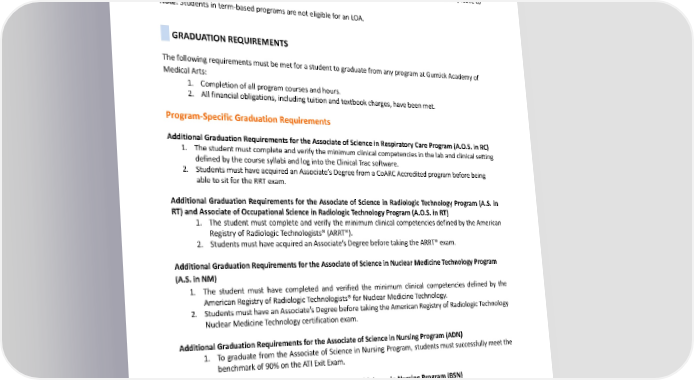 MedicalArtswebsite. Academic The Institution determines academic LOA and is limited to students in a non-term program who have completed at least one course while in good academic standing. Students who have received a transfer of credits with a gap of non-attendance in their program schedule may be required to take an involuntary leave to suspendstudiestemporarily. Note:Studentsinterm-basedprogramsarenoteligibleforanLOA. GRADUATIONREQUIREMENTS ThefollowingrequirementsmustbemetforastudenttograduatefromanyprogramatGurnickAcademyof MedicalArts: 1. Completionofallprogramcoursesandhours. 2. All financial obligations, including tuition and textbook charges, have been met. Program-Specific Graduation Requirements Additional Graduation Requirements for the Associate of Science in Respiratory Care Program (A.O.S. in RC) 1. Thestudentmustcompleteandverifytheminimumclinicalcompetenciesinthelabandclinicalsetting defined by the course syllabi and log into the Clinical Trac software. 2. Students must have acquired an Associate’s Degree from a CoARC Accredited program before being able to sit for the RRT exam. Additional Graduation Requirements for the Associate of Science in Radiologic Technology Program (A.S. in RT)andAssociateofOccupationalScienceinRadiologicTechnologyProgram(A.O.S.inRT) 1. The student must complete and verify the minimum clinical competencies defined by the American Registry of Radiologic Technologists® (ARRT®). 2. Students must have acquired an Associate’s Degree before taking the ARRT® exam. Additional Graduation Requirements for the Associate of Science in Nuclear Medicine Technology Program (A.S. in NM) 1. The student must have completed and verified the minimum clinical competencies defined by the AmericanRegistryofRadiologicTechnologists®forNuclearMedicineTechnology. 2. Students must have an Associate’s Degree before taking the American Registry of Radiologic Technology Nuclear Medicine Technology certification exam. Additional Graduation Requirements for the Associate of Science in Nursing Program (ADN) 1. To graduate from the Associate of Science in Nursing Program, students must successfully meet the benchmarkof90%ontheATIExitExam. Additional Graduation Requirements for the Bachelor of Science in Nursing Program (BSN) 1. To graduate from the Bachelor of Science in Nursing Program, students must successfully meet the benchmarkof90%ontheATIExitExam. Additional Graduation Requirements for the Bachelor of Science in Radiation Therapy (B.S. in RT) 1. The student must have completed and verified the minimum clinical competencies defined by the AmericanRegistryofRadiologicTechnologists®. 162