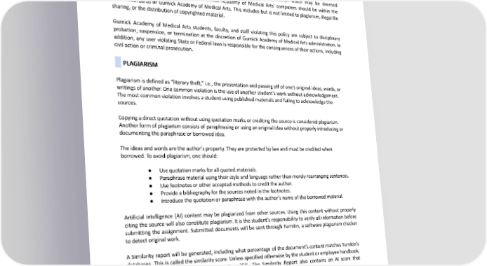 at www.copyright.gov/help/faq. FILE SHARING The computers at Gurnick AcademyofMedicalArtsarestrictlyforsupportingtheschool’smissionandareonly used by our students, faculty, and staff. No user should perform any action which may be deemed inappropriate or dangerous. All use of Gurnick Academy of Medical Arts’ computers should be within the ethical standards of Gurnick Academy of Medical Arts. This includes but is not limited to plagiarism, illegal file sharing, or the distribution of copyrighted material. Gurnick Academy of Medical Arts students, faculty, and staff violating this policy are subject to disciplinary probation, suspension, or termination at the discretion of Gurnick Academy of Medical Arts administration. In addition, any user violating State or Federal laws is responsible for the consequences of their actions, including civil action or criminal prosecution. PLAGIARISM Plagiarism is defined as “literary theft,” i.e., the presentation and passing off of one’s original ideas, words, or writings of another. One common violation is the use of another student’s work without acknowledgement. Themostcommonviolationinvolvesastudentusingpublishedmaterialsandfailingtoacknowledgethe sources. Copyingadirectquotationwithoutusingquotationmarksorcreditingthesourceisconsideredplagiarism. Anotherformofplagiarismconsistsofparaphrasingorusinganoriginalideawithoutproperlyintroducingor documentingtheparaphraseorborrowedidea. Theideasandwordsaretheauthor’sproperty.Theyareprotectedbylawandmustbecreditedwhen borrowed.Toavoidplagiarism,oneshould: ● Usequotationmarksforallquotedmaterials. ● Paraphrasematerial using their style and language rather than merely rearranging sentences. ● Usefootnotesorotheracceptedmethodstocredittheauthor. ● Provide a bibliography for the sources noted in the footnotes. ● Introduce the quotation or paraphrase with the author’s name of the borrowed material. Artificial intelligence (AI) content may be plagiarized from other sources. Using this content without properly citing the source will also constitute plagiarism. It is the student’s responsibility to verify all information before submitting the assignment. Submitted documents will be sent through Turnitin, a software plagiarism checker to detect original work. A Similarity report will be generated, including what percentage of the document’s content matches Turnitin’s databases. This is called the similarity score. Unless specified otherwise by the student or employee handbook, the similarity score should be no more than 25%. The Similarity Report also contains an AI score that determinestheamountofthedocumentwrittenbyanAItool. Unless the student or employee handbook specifies otherwise, the AI score should be no more than 25%. Please refer to the “Use of AI Tools” in the student catalog and student handbook for details on the permitted useofAIforeachprogram. 140