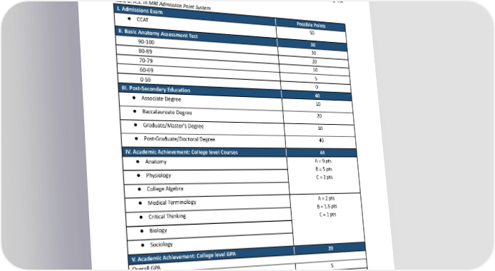 completed within the last five (5) years. All credit granting is subject to approval from the Program Director or Program Coordinator. Please allow seven (7) days for review. Associate of Science in MRI Admission Point System Applicants are deemed qualified on a point system. The highest-ranked applicants (above a minimum) may be offered seats in the program. The following point system evaluates each applicant, showing the maximumachievablescore. Table 8. A.S. in MRI Admission Point System I. Admissions Exam Possible Points 50 ● CCAT II. Basic Anatomy Assessment Test 30 30 ● 90-100 20 ● 80-89 10 ● 70-79 5 ● 60-69 0 ● 0-59 III. Post-Secondary Education 40 10 ● AssociateDegree 20 ● BaccalaureateDegree 30 ● Graduate/Master’sDegree 40 ● Post-Graduate/DoctoralDegree IV. Academic Achievement: College level Courses 44 A=9pts ● Anatomy B=5pts ● Physiology C=2pts ● CollegeAlgebra A=2pts ● MedicalTerminology B=1.5pts ● Critical Thinking C=1pts ● Biology ● Sociology V. AcademicAchievement:CollegelevelGPA 20 Overall GPA 5 ● GPA3.0 10 ● GPA3.5 20 ● GPA3.9 VI. One-Page Resume(required) 20 VII. Health Care Background 20 10 ● Onetothree(1–3)years 35