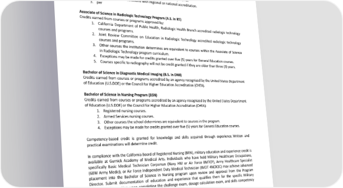 Students who fail RN 402 may submit proof of passing the NCLEX-RN exam to obtain credit for RN 402 and graduate from the ADN Program. All other graduation requirements (i.e., zero account balance) must also be met. Associate of Science in Physical Therapist Assistant Program (A.S. in PTA) Credits earned from courses or programs approved by: 1. Credits earned from courses or programs accredited by CAPTE. 2. Credits earned at institutions with regional or national accreditation. 3. per Associate of Science in Radiologic Technology Program (A.S. in RT) Credits earned from courses or programs approved by: 1. California Department of Public Health, Radiologic Health Branch accredited radiologic technology courses and programs. 2. Joint Review Committee on Education in Radiologic Technology accredited radiologic technology courses and programs. 3. Other courses the institution determines are equivalent to courses within the Associate of Science in Radiologic Technology program curriculum. 4. Exceptions may be madeforcredits granted over five (5) years for General Education courses. 5. Coursesspecific to radiography will not be credit granted if they are older than three (3) years. BachelorofScienceinDiagnosticMedicalImaging(B.S.inDMI) Credits earned from courses or programs accredited by an agency recognized by the United States Department of Education (U.S.DOE) or the Council for Higher Education Accreditation (CHEA). BachelorofScienceinNursingProgram(BSN) Credits earned from courses or programs accredited by an agency recognized by the United States Department of Education (U.S.DOE) or the Council for Higher Education Accreditation (CHEA): 1. Registered nursing courses. 2. ArmedServicesnursingcourses. 3. Othercoursestheschooldeterminesareequivalenttocoursesintheprogram. 4. Exceptions may be madeforcredits granted over five (5) years for General Education courses. Competency-based credit is granted for knowledge and skills acquired through experience. Written and practical examinations will determine credit. In compliance with the California Board of Registered Nursing (BRN), military education and experience credit is available at Gurnick Academy of Medical Arts. Individuals who have held Military Healthcare Occupations, specifically Basic Medical Technician Corpsman (Navy HM or Air Force BMTCP), Army Healthcare Specialist (68W Army Medic), or Air Force Independent Duty Medical Technician (IMDT 4NOX1C) may achieve advanced placement into the Bachelor of Science in Nursing program upon review and approval from the Program Director. Submit documentation of education and experience that qualifies them for the specific Military Healthcare Occupation upon completing the challenge exam, dosage calculation exam, and skills competency evaluation. ● Applicants must meet all Bachelor Degree Nursing Program admission requirements and complete designated prerequisites and the current Test of Essential Academic Skills (TEAS) with a minimum score of 64% and a minimumGPAof2.5. ● Applicants must submit proof of honorable discharge from the military and proof of military service within the last five (5) years. 78