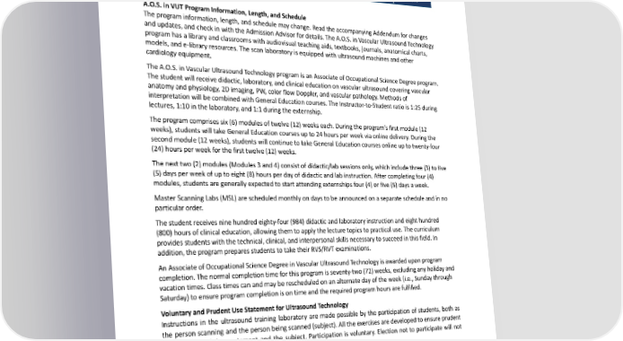 VU403L UpperExtremityArterial System Lab 28.0 1.0 VUX01 Clinical 1 400.0 13.0 VUX02 Clinical 2 400.0 13.0 TOTAL 1,784.0 105.0 GeneralEducationCoursesareidentifiedinItalics. A.O.S. in VUT Program Information, Length, and Schedule Theprograminformation,length,andschedulemaychange.ReadtheaccompanyingAddendumforchanges andupdates,andcheckinwiththeAdmissionAdvisorfordetails.TheA.O.S.inVascularUltrasoundTechnology programhasalibraryandclassroomswithaudiovisualteachingaids,textbooks,journals,anatomicalcharts, models,ande-libraryresources. The scan laboratory is equipped with ultrasound machines and other cardiology equipment. TheA.O.S.inVascularUltrasoundTechnologyprogramisanAssociateofOccupationalScienceDegreeprogram. Thestudentwillreceivedidactic, laboratory, and clinical education on vascular ultrasound covering vascular anatomyandphysiology,2Dimaging,PW,colorflowDoppler,andvascularpathology.Methodsof interpretation will be combined with General Education courses. The Instructor-to-Student ratio is 1:25 during lectures, 1:10 in the laboratory, and 1:1 during the externship. Theprogramcomprisessix(6)modulesoftwelve(12)weekseach.Duringtheprogram’sfirstmodule(12 weeks), students will take General Education courses up to 24 hours per week via online delivery. During the secondmodule(12weeks),studentswillcontinuetotakeGeneralEducationcoursesonlineuptotwenty-four (24) hours per week for the first twelve (12) weeks. Thenexttwo(2)modules(Modules3and4)consistofdidactic/labsessionsonly,whichincludethree(3)tofive (5) days per week of up to eight (8) hours per day of didactic and lab instruction. After completing four (4) modules,studentsaregenerallyexpectedtostartattendingexternshipsfour(4)orfive(5)daysaweek. MasterScanningLabs(MSL)arescheduledmonthlyondaystobeannouncedonaseparatescheduleandinno particular order. Thestudentreceivesninehundredeighty-four(984)didacticandlaboratoryinstructionandeighthundred (800) hours of clinical education, allowing them to apply the lecture topics to practical use. The curriculum provides students with the technical, clinical, and interpersonal skills necessary to succeed in this field. In addition, the program prepares students to take their RVS/RVT examinations. AnAssociateofOccupationalScienceDegreeinVascularUltrasoundTechnologyisawardeduponprogram completion. The normal completion time for this program is seventy-two (72) weeks, excluding any holiday and vacation times. Class times can and may be rescheduled on an alternate day of the week (i.e., Sunday through Saturday) to ensure program completion is on time and the required program hours are fulfilled. Voluntary and Prudent Use Statement for Ultrasound Technology Instructions in the ultrasound training laboratory are made possible by the participation of students, both as the person scanning and the person being scanned (subject). All the exercises are developed to ensure prudent and safe use of the equipment and the subject. Participation is voluntary. Election not to participate will not affect grades. However, alternate training will need to be arranged. 186