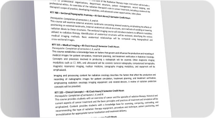 for professional practice as an SN with a BSN. This portfolio is the exit project for the bachelor’s degree in Nursing program. BachelorofScienceinRadiationTherapy(B.S.inRT)Courses–FullDistanceEducationProgram RTT250–IntroductiontoRadiationTherapy–30ClockHours/2SemesterCreditHours Prerequisite: Completion of GE 020A, GE 020B, GE 222, and GE 240. This course will provide students with an overview of the Radiation Therapy major. Instruction will include a review of professional organizations, department structure, patient management, record keeping, and professional ethics. An overview of the radiation therapist’s role in cancer treatment, including a review of the therapist’s scope of practice, developing modalities, and advanced career opportunities, takes place. RTT300–Sectional/TopographicAnatomy–45ClockHours/3SemesterCreditHours Prerequisite: Completion of semesters I, II, and III. This course will examine external anatomic landmarks concerning internal anatomy, emphasizing the effects of positioning on external landmarks, internal anatomical critical structures, and methods of avoiding or lowering radiation doses to these structures. The sectional imaging course will introduce students to different modalities utilized in radiation therapy. Identification of anatomical structures will be reviewed, identifying the various medical imaging methods. Basic anatomical relationships will be compared using topographical and cross-sectional images. RTT315–MedicalImaging–45ClockHours/3SemesterCreditHours Prerequisite: Completion of semesters I, II, and III. This course establishes a knowledge base on factors that govern and influence the production and recording of medical images for patient simulation, treatment planning, and treatment verification in Radiation Oncology. Concepts and processes involved in producing a radiograph will be covered. Other diagnostic imaging modalities such as CT, MRI, and ultrasound will be covered. General radiography, computerized tomography, magnetic resonance imaging, nuclear medicine, sonography imaging modalities, and equipment will be emphasized. Imaging and processing content for radiation oncology describes the factors that affect the production and recording of radiographic images for patient simulation, treatment planning, and treatment verification, emphasizing radiation oncology imaging equipment and related devices. A review of radiation protection conceptswill be provided. RTT320–ClinicalConceptsI–45ClockHours/3SemesterCreditHours Prerequisite: Completion of semesters I, II, and III. This course provides students with an overview of cancer and the specialty of radiation therapy. Historical and current aspects of cancer treatment and the basic principles and practices of treatment and simulation will be emphasized. Content provides students with a knowledge base for assessing, comparing, contrasting, and recommending the type of radiation therapy equipment, procedure and technique, patient positioning, and immobilization for appropriate tumor localization and treatment delivery. RTT330–Ethics–25ClockHours/1.5SemesterCreditHours Prerequisite: Completion of semesters I, II, and III. This course examines professionalism and bioethics, the process of making moral decisions, ethical issues, professional oaths and codes of ethics, health care ethics, and the law. RTT340–RadiationTherapyPatientCare–45ClockHours/3SemesterCreditHours Prerequisite: Completion of semesters I, II, and III. This course will focus on the foundational concepts and competencies in evaluating patients before, during, and 301