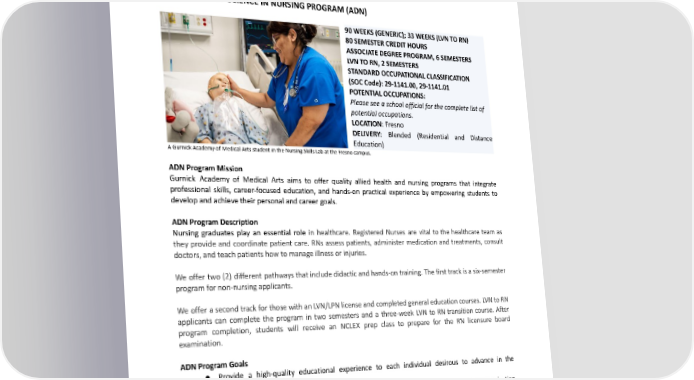 Students will attend up to forty (40) hours per week of instruction, including didactic, labs, and clinical. Clinical activities may be held during weekdays or weekends, and shifts may include day or evening as the clinical site requires. Didactic courses are held between 8:00 AM to 8:00 PM. Students receive 1,414 hours of didactic and laboratory instruction and 1,232 hours of clinical education, allowing them to apply the lecture topics to practical use. ASSOCIATEOFSCIENCEINNURSINGPROGRAM(ADN) 90WEEKS(GENERIC);33WEEKS(LVNTORN) 80SEMESTERCREDITHOURS ASSOCIATEDEGREEPROGRAM,6SEMESTERS LVNTORN,2SEMESTERS STANDARDOCCUPATIONALCLASSIFICATION (SOCCode):29-1141.00,29-1141.01 POTENTIALOCCUPATIONS: Please see a school official for the complete list of potential occupations. LOCATION:Fresno DELIVERY: Blended (Residential and Distance Education) AGurnickAcademyofMedicalArtsstudentintheNursingSkillsLabattheFresnocampus. ADNProgramMission Gurnick Academy of Medical Arts aims to offer quality allied health and nursing programs that integrate professional skills, career-focused education, and hands-on practical experience by empowering students to developandachievetheirpersonalandcareergoals. ADNProgramDescription Nursing graduates play an essential role in healthcare. Registered Nurses are vital to the healthcare team as they provide and coordinate patient care. RNs assess patients, administer medication and treatments, consult doctors, and teach patients how to manage illness or injuries. Weoffer two (2) different pathways that include didactic and hands-on training. The first track is a six-semester programfornon-nursingapplicants. Weoffer asecondtrackforthosewithanLVN/LPNlicenseandcompletedgeneraleducationcourses.LVNtoRN applicants can complete the program in two semesters and a three-week LVN to RN transition course. After program completion, students will receive an NCLEX prep class to prepare for the RN licensure board examination. ADNProgramGoals ● Provide a high-quality educational experience to each individual desirous to advance in the healthcare profession. ● Provide adepthofhumanunderstandingandawiderangeofnursingskillsbasedoncommunication andscientific principles. ● Guide the Associate Degree student in collaborative practice with other healthcare professionals to meetpatientnursingneeds. ● Employthenursingprocessintheprovisionofsafeandeffectivecare. 192