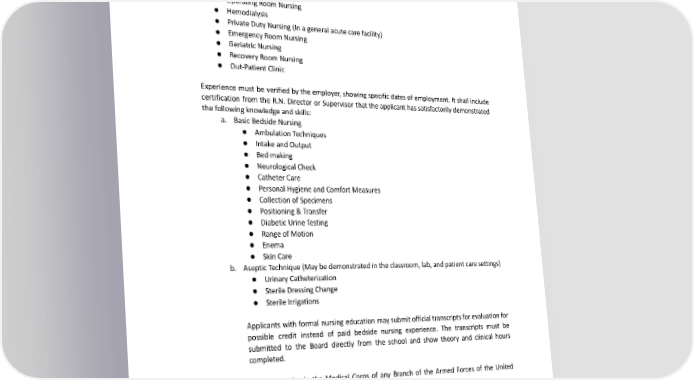Experience in any of the following areas may be substituted for a maximum of eight (8) months of medical/surgical experience: ● CommunicableDiseaseNursing ● PublicHealthNursing ● IndustrialNursing ● OfficeNursing(M.D.) ● PsychiatricNursing ● OperatingRoomNursing ● Hemodialysis ● PrivateDutyNursing(Inageneralacutecarefacility) ● EmergencyRoomNursing ● GeriatricNursing ● RecoveryRoomNursing ● Out-PatientClinic Experience must be verified by the employer, showing specific dates of employment. It shall include certification from the R.N. Director or Supervisor that the applicant has satisfactorily demonstrated thefollowing knowledgeandskills: a. Basic Bedside Nursing ● AmbulationTechniques ● IntakeandOutput ● Bedmaking ● NeurologicalCheck ● CatheterCare ● PersonalHygieneandComfortMeasures ● CollectionofSpecimens ● Positioning&Transfer ● DiabeticUrineTesting ● RangeofMotion ● Enema ● SkinCare b. Aseptic Technique (May be demonstrated in the classroom, lab, and patient care settings) ● UrinaryCatheterization ● SterileDressingChange ● SterileIrrigations Applicants with formal nursing education may submit official transcripts for evaluation for possible credit instead of paid bedside nursing experience. The transcripts must be submitted to the Board directly from the school and show theory and clinical hours completed. c. Nursing Service in the Medical Corps of any Branch of the Armed Forces of the United States. This method requires you to ● Submit proof of having at least twelve (12) months of active duty in the Armed Forces medical corps, rendering bedside patient care. The proof submitted must showthedate(s)andwardsassigned. ● Submit proof of completing a basic course of instruction in nursing while in the armedforces. ● Submitproofthatservicewashonorable(DD-214). 93