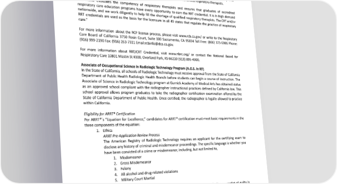 applicant was convicted of a crime and incarcerated, more than seven (7) years from when the applicant was released from incarceration. The National Board for Respiratory Care provides the testing needed to become registered, significantly improving employment opportunities. “The RRT credential is nationally recognized as the “standard of excellence” for respiratory care professionals. The examinations for the RRT credential objectively and uniformly measureessential knowledge, skills, and abilities required of advanced respiratory therapists. The NBRC evaluates the competency of respiratory therapists and ensures that graduates of accredited respiratory care education programs have every opportunity to earn the RRT credential. It is in high demand nationwide, and we work diligently to help fill the shortage of qualified respiratory therapists. The CRT and/or RRT credentials are used as the basis for the licensure in all 49 states that regulate the practice of respiratory care.” For more information about the RCP license process, please visit www.rcb.ca.gov/ or write to the Respiratory Care Board of California 3750 Rosin Court, Suite 100 Sacramento, CA 95834 Toll Free: (866) 375-0386 Phone: (916) 999-2190 Fax: (916) 263-7311 Email:[email protected]. For more information about RRT/CRT Credential, visit www.nbrc.org/ or contact the National Board for Respiratory Care 10801 Mastin St #300, Overland Park, KS 66210 (913) 895-4900. Associate of Occupational Science in Radiologic Technology Program (A.O.S. in RT) In the State of California, all schools of Radiologic Technology must receive approval from the State of California Department of Public Health Radiologic Health Branch before students can begin a course of instruction. The Associate of Science in Radiologic Technology program at Gurnick Academy of Medical Arts has obtained status as an approved school compliant with the radiographer instructional practices defined by California law. This school approval allows program graduates to take the radiographer certification examination offered by the State of California Department of Public Health. Once certified, the radiographer is legally allowed to practice within California. Eligibility for ARRT® Certification Per ARRT®´s “Equation for Excellence,” candidates for ARRT® certification must meet basic requirements in the three componentsoftheequation: 1. Ethics ARRTPre-ApplicationReviewProcess The American Registry of Radiologic Technology requires an applicant for the certifying exam to disclose any history of criminal and misdemeanor proceedings. The specific language is whether you havebeenconvictedofacrimeormisdemeanor,including,butnotlimitedto, 1. Misdemeanor 2. GrossMisdemeanor 3. Felony 4. All alcohol and drug-related violations 5. Military Court Martial For this section, “Convicted” includes a criminal proceeding where a finding or verdict of guilty is madeorreturned,but 1. Theadjudication of guilt is either withheld, deferred, or not entered; or 2. Thesentenceissuspendedorstayed,or 3. A criminal proceeding where the individual enters a plea of guilty or no contest (nolo contendere) or 4. Thereisapre-trial diversion. 82
