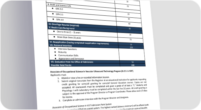 45 ● Post-Graduate/DoctoralDegree III. Academic Achievement: College level Courses & High school AP courses A. Overall GPA 5 ● GPA3.0 10 ● GPA3.5 15 ● GPA3.9 B. MathandScienceGPA 20 ● GPA3.0 30 ● GPA3.5 40 ● GPA3.9 IV. One-Page Resume(required) 30 V. Health Care Background 10 ● Onetothree(1–3)years 25 ● Morethanthree(3)years VI. Reapplication (having completed reapplication requirements) 15 VII. Personal Interview 150 ● InterviewQuestions ● Maturity ● CommunicationSkills ● AppearanceandDemeanor VII. Evaluation from the Office of Admissions 50 Possible Total Points: 430 Associate of Occupational Science in Vascular Ultrasound Technology Program (A.O.S. in VUT) Applicants must: 1. AttendorviewaliveorrecordedInformationSession. 2. Submit original transcripts from the Registrar at an educational institution for applicants requesting credit granting for some/all granting for some/all General Education courses. Copies are not accepted. All coursework must be completed and given a grade of at least a “C.” Anatomy and Physiology I with Laboratory must be completed within the last five (5) years. All credit granting is subject to the approval of the Program Director or Program Coordinator. Please allow seven (7) days for review. 3. CompleteanadmissioninterviewwiththeProgramDirectoranddesignees. Associate of Occupational Science in VUT Admission Point System Applicants are deemed qualified on a point system. The highest-ranked (above a minimum) will be offered seats in the program. The following point system evaluates each applicant, showing the maximum score achievable. Table 7. A.O.S. in VUT Admission Point System I. Admissions Exam Possible Points 25 ● Anatomy&PhysiologyAssessmentTest(100-85) 20 ● Anatomy&PhysiologyAssessmentTest(84-80) 15 ● Anatomy&PhysiologyAssessmentTest(79-69) 10 33